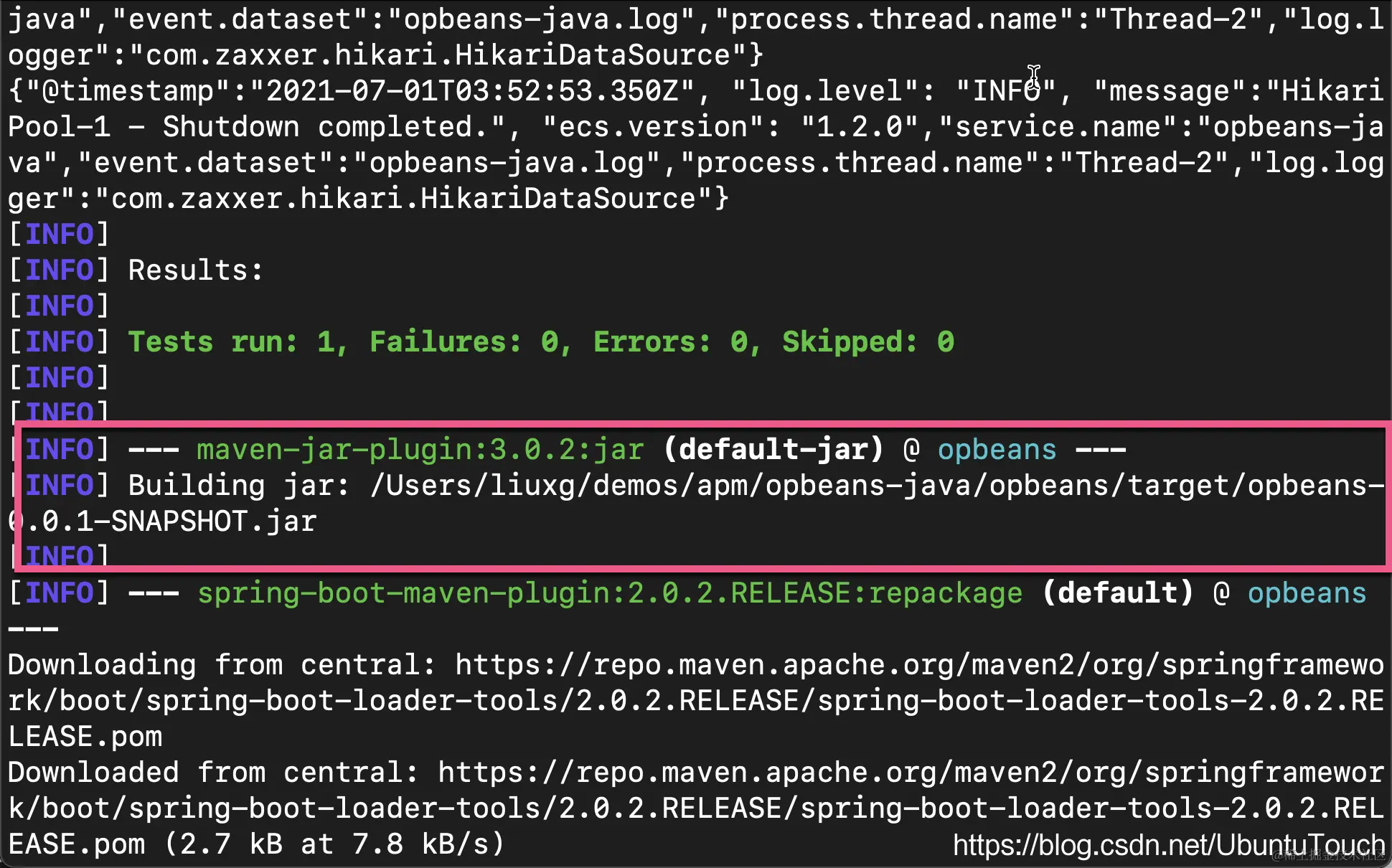 在上面,我们可以看到一个叫做 opbeans-0.0.1-SNAPSHOT.jar 的 jar 文件以及被成功生成,并在 target 目录下: