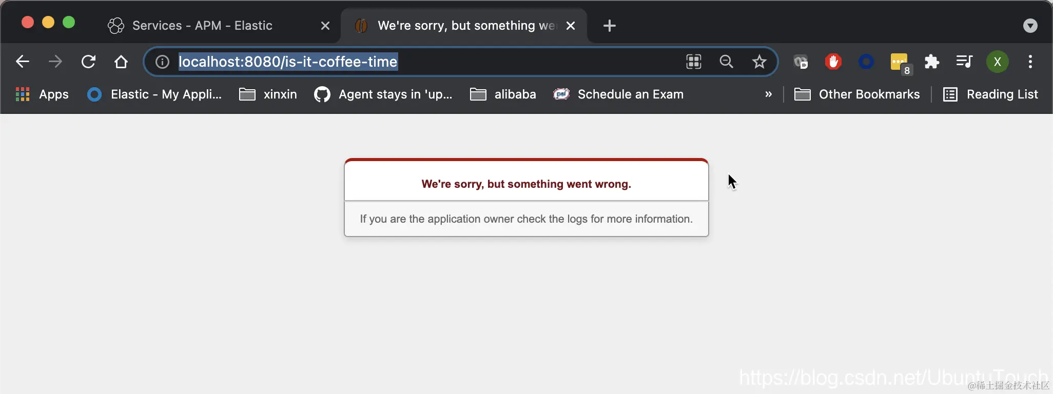 为了能够在下面的分析中看到一些错误的信息,我们故意在 Spring Boot 的应用中访问不存在的地址:http://localhost:8080/is-it-coffee-time