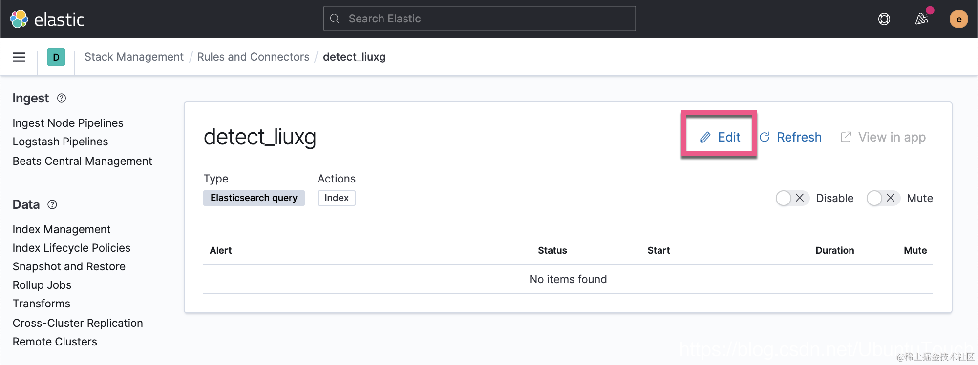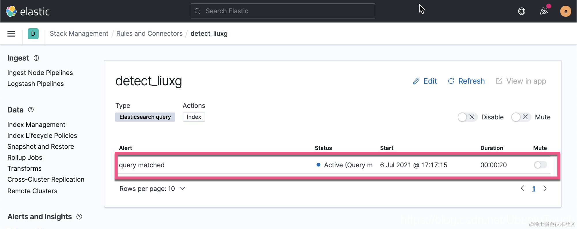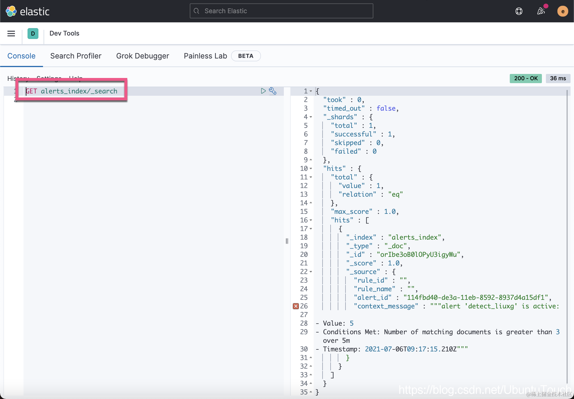 我们看到已经有一个警报写入到我们定义的索引 alerts_index 中了。它说明我们的警报已经起作用了。