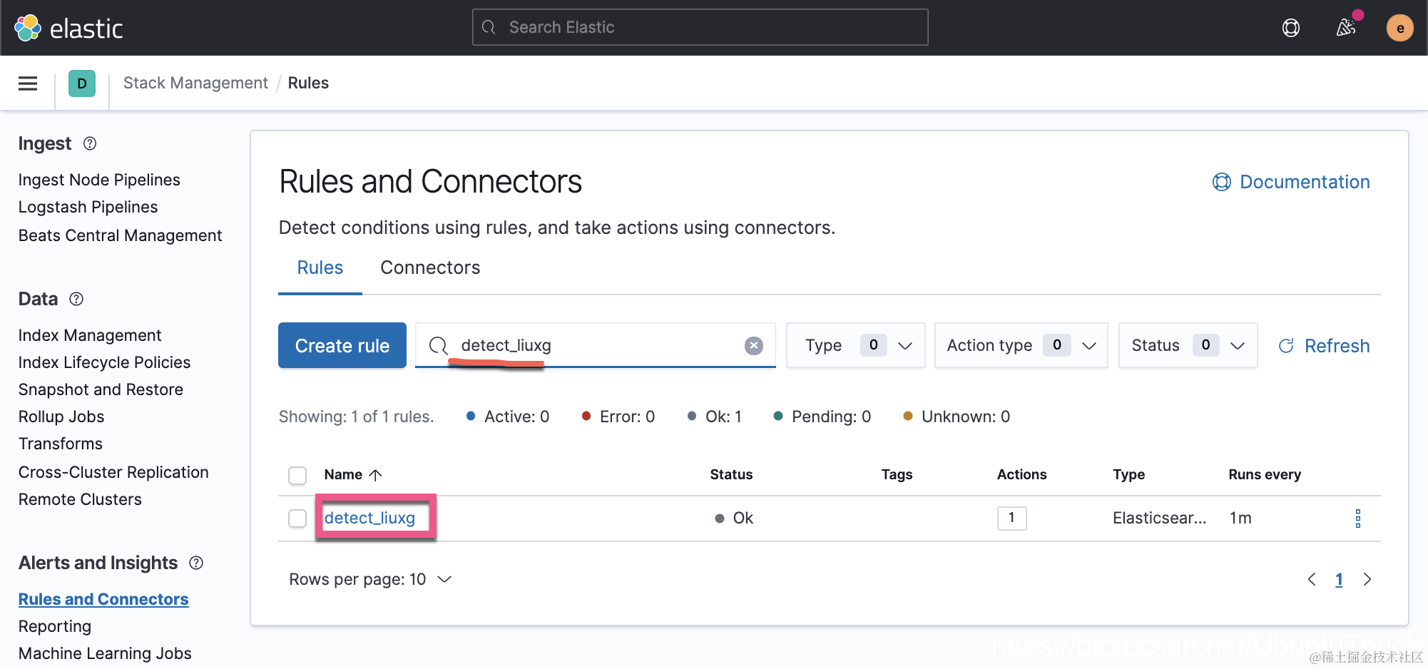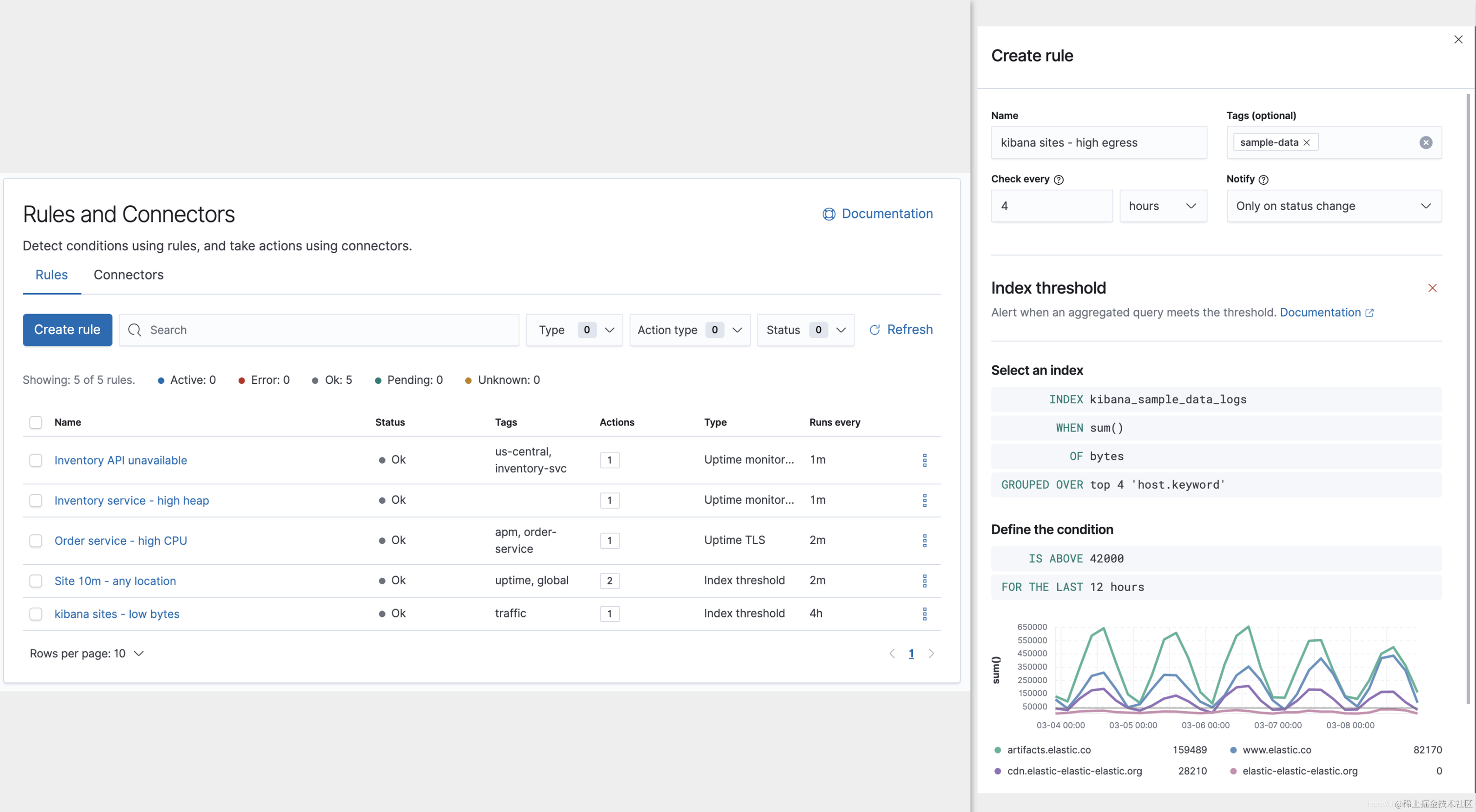 规则由条件(conditions) 、动作(actions) 和调度(schedule) 组成。 当条件满足时,将创建呈现动作并调用它们的警报。 为了简化操作设置和更新,操作使用连接器来集中用于连接 Kibana 服务和第三方集成的信息。 以下示例将这些概念联系在一起: