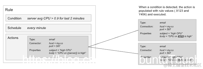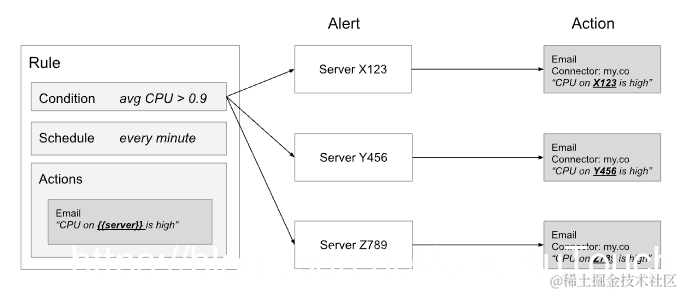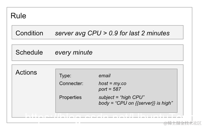 例如,在监控一组服务器时,规则可能会检查每台服务器上过去两分钟(条件)的平均 CPU 使用率 > 0.9,每分钟检查一次(schedule),通过 SMTP 发送警告电子邮件消息,主题为 “CPU on {{server}} is high”(action)。
