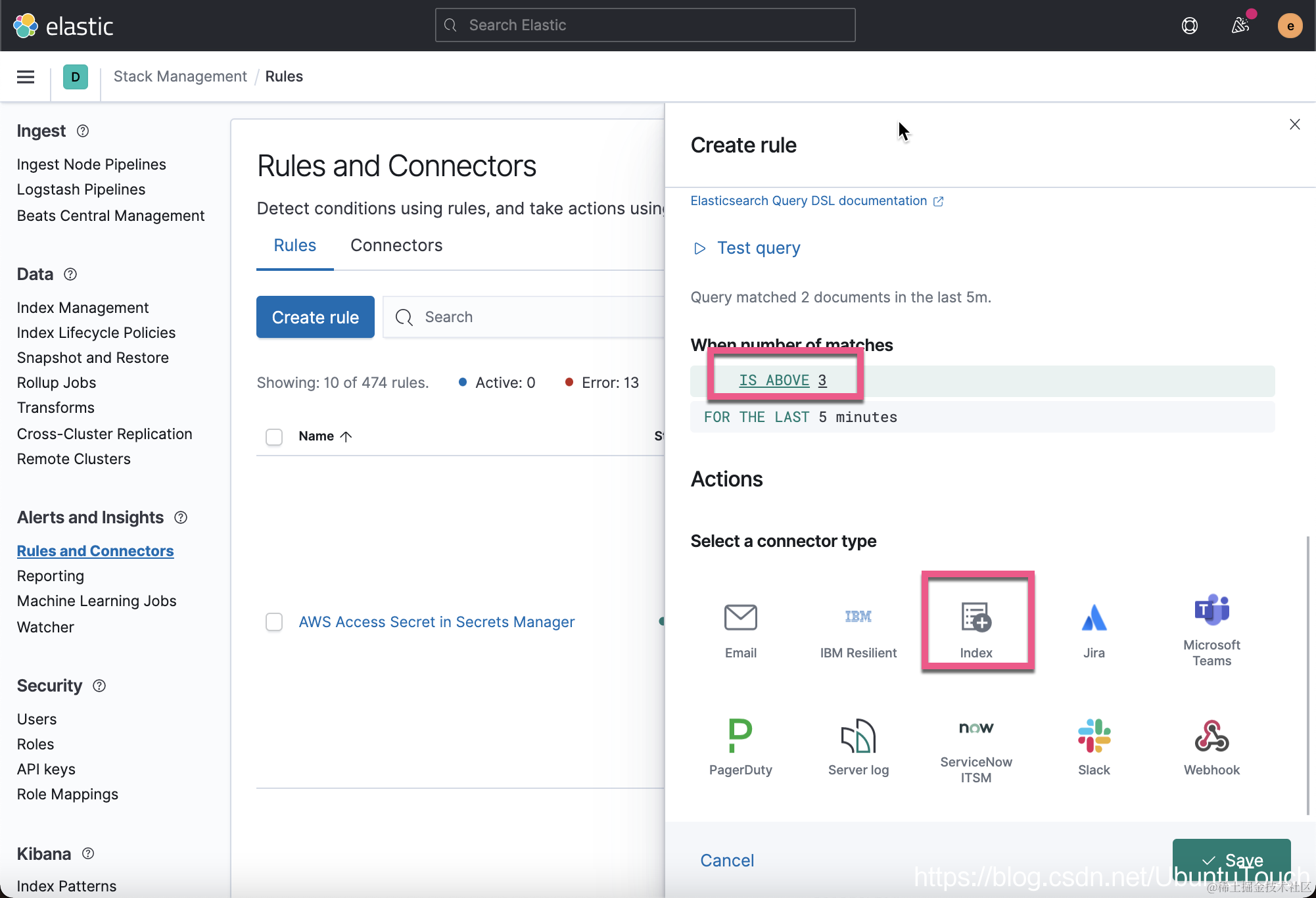 在上面,在5分钟之内,我们选择 match 的数量是超过3个就满足条件。当添加满足时,我们选择 Index 连接器: