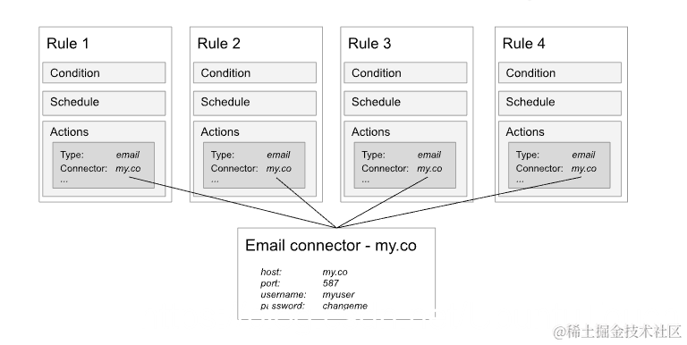 连接器提供了一个中心位置来存储服务和集成的连接信息。 例如,如果四个规则通过同一个 SMTP 服务发送电子邮件通知,它们都可以引用同一个 SMTP 连接器。 当 SMTP 设置更改时,你可以在连接器中更新一次,而不必更新四个规则。
