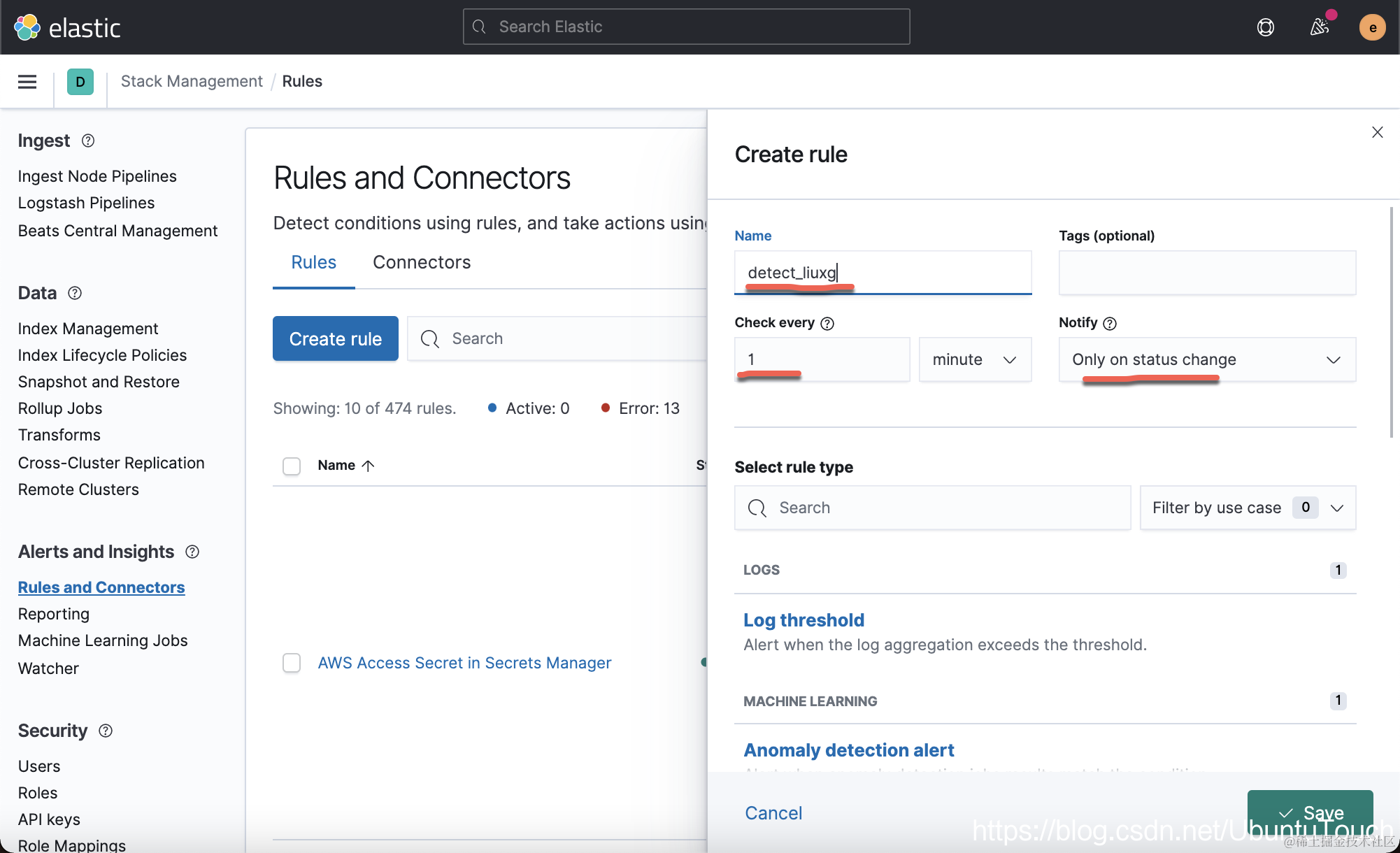 Kibana 警报规则可以在各种应用程序中创建,包括 APM、机器学习、指标、安全性、Uptime 和管理 UI。 虽然警报详细信息可能因应用程序而异,但它们共享一个通用接口,用于定义和配置本节更详细描述的规则。