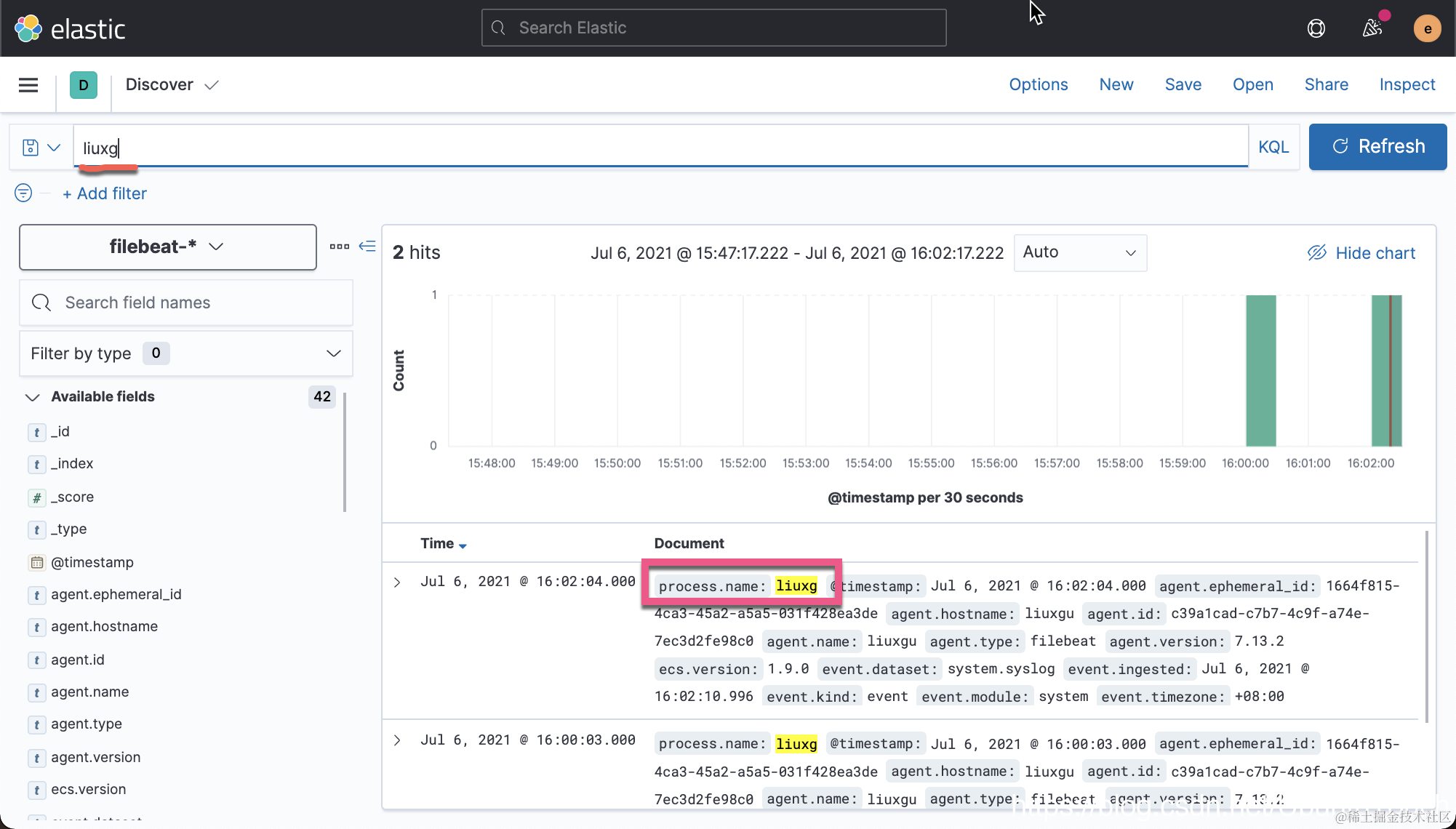 上述命令将生成一个 system 日志,并且它的 process.name 是 liuxg。我们可以在 Kibana 的 Discover 中查找:
