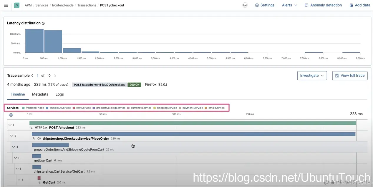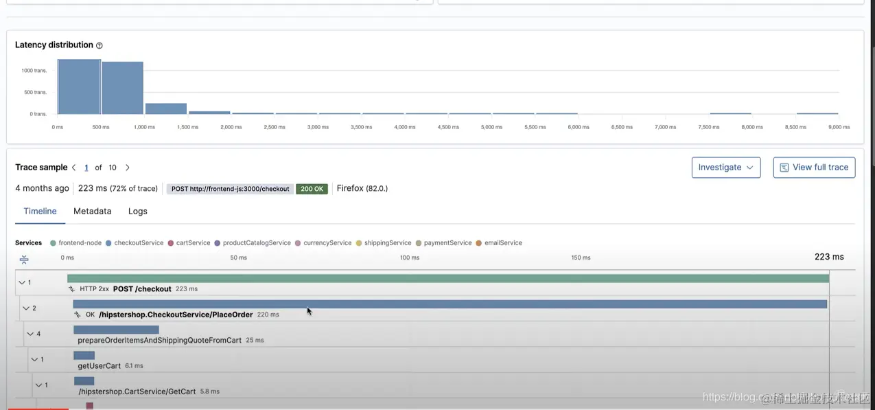 在上面,它展示了 frontend-node 这个服务端的所有的 transactions。针对其中的 POS /checkout 这个 transactiion:
