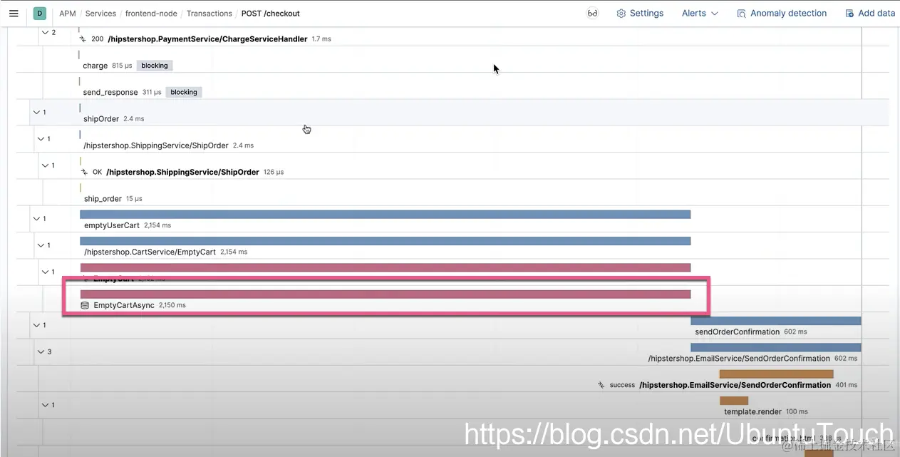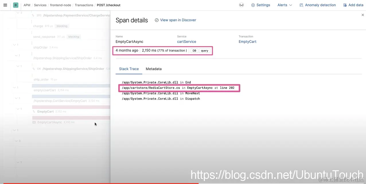 在上面,我们可以清楚地看出来 EmptyCart 竟然需要花去 2154 ms 的时间。在这个服务中,它调用了 EmptyCartAsync 来完成的。它花去了 2150 ms 的时间来完成。我们点击上面的 EmptyCartAsync 这个 Span,我们可以看到更多的调用细节: