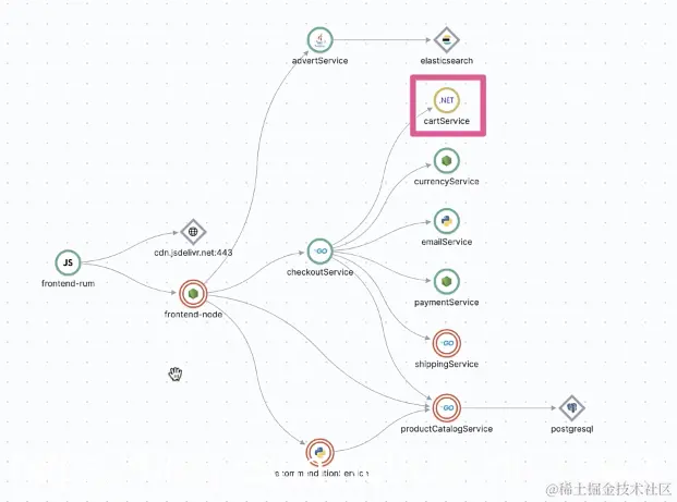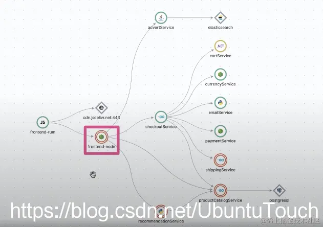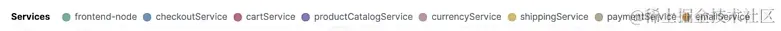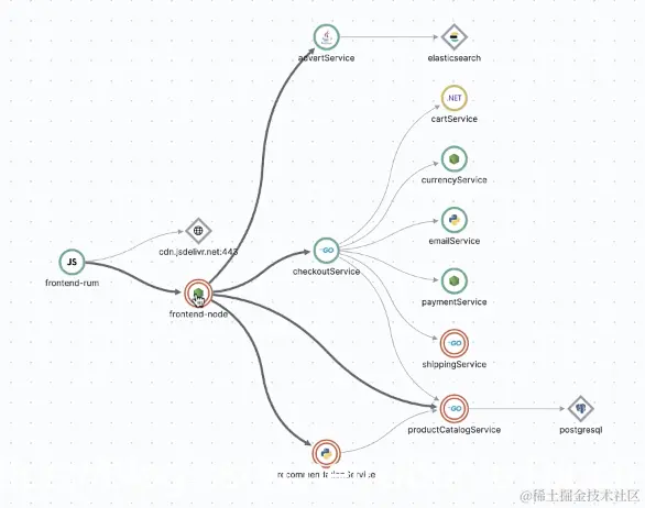 在上面,我们展示了各种服务的一个总览信息。如上所示,我们可以看到系统运行的 environment,latency,throughput 以及 error rate。这里的各种服务可以是有各种语言来完成的。 如上所示,这些服务可以是 go 应用,也可以是 Python, .NET, JS,NodeJS, Java 等等。对于 APM 应用产品来说,一个很挑战性的工作就是很难把不同服务的 trace 进行相互关联。从上面的图中,我们很难看出来 frontend-node 这个 NodeJS 应用是否直接调用 advertService 这个服务?它们直接到底有什么联系?如果是,它们到底是如何发生的?