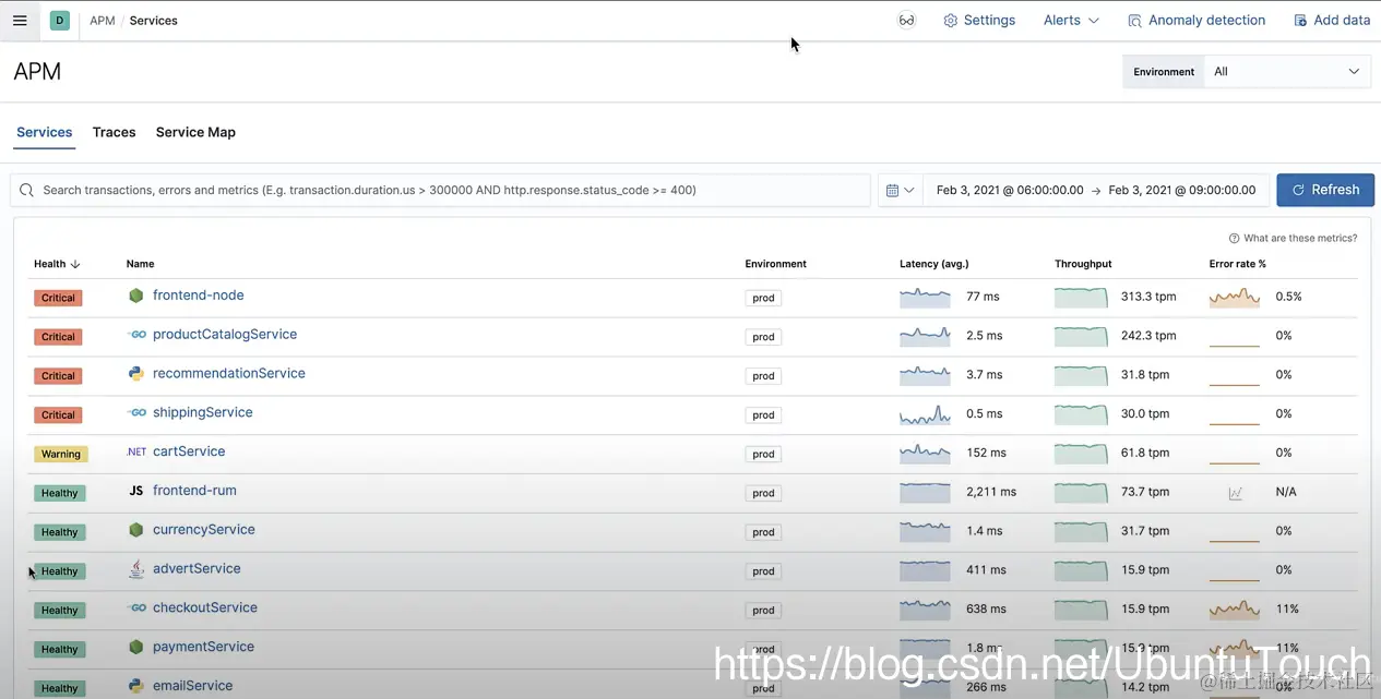 当我们把这些数据收集到 Elasticsearch 之后,在 Kibana 中的 APM 应用中,我们可以看见一系列的服务的列表: