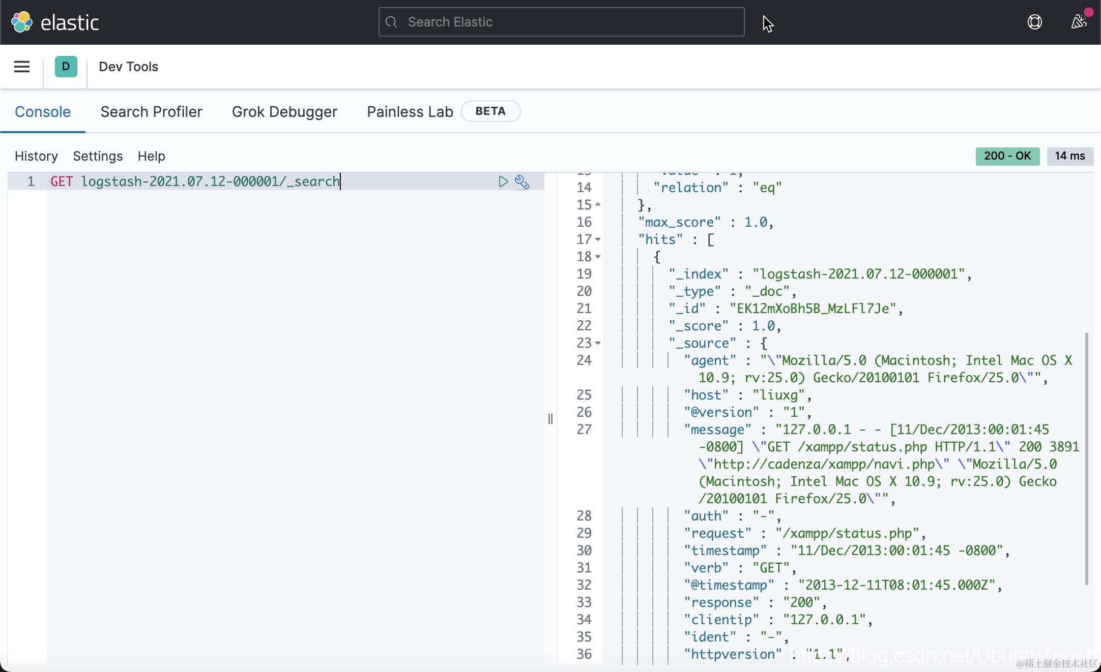 现在你应该可以在 Elasticsearch 中看到你的 apache 日志数据! Logstash 打开并读取指定的输入文件,处理它遇到的每个事件。 记录到此文件的任何其他行也将被 Logstash 作为事件捕获、处理并存储在 Elasticsearch 中。 作为一个额外的好处,它们隐藏在字段 “type” 设置为 “apache_access” 的情况下(这是由输入配置中的 type⇒“apache_access” 行完成的)。