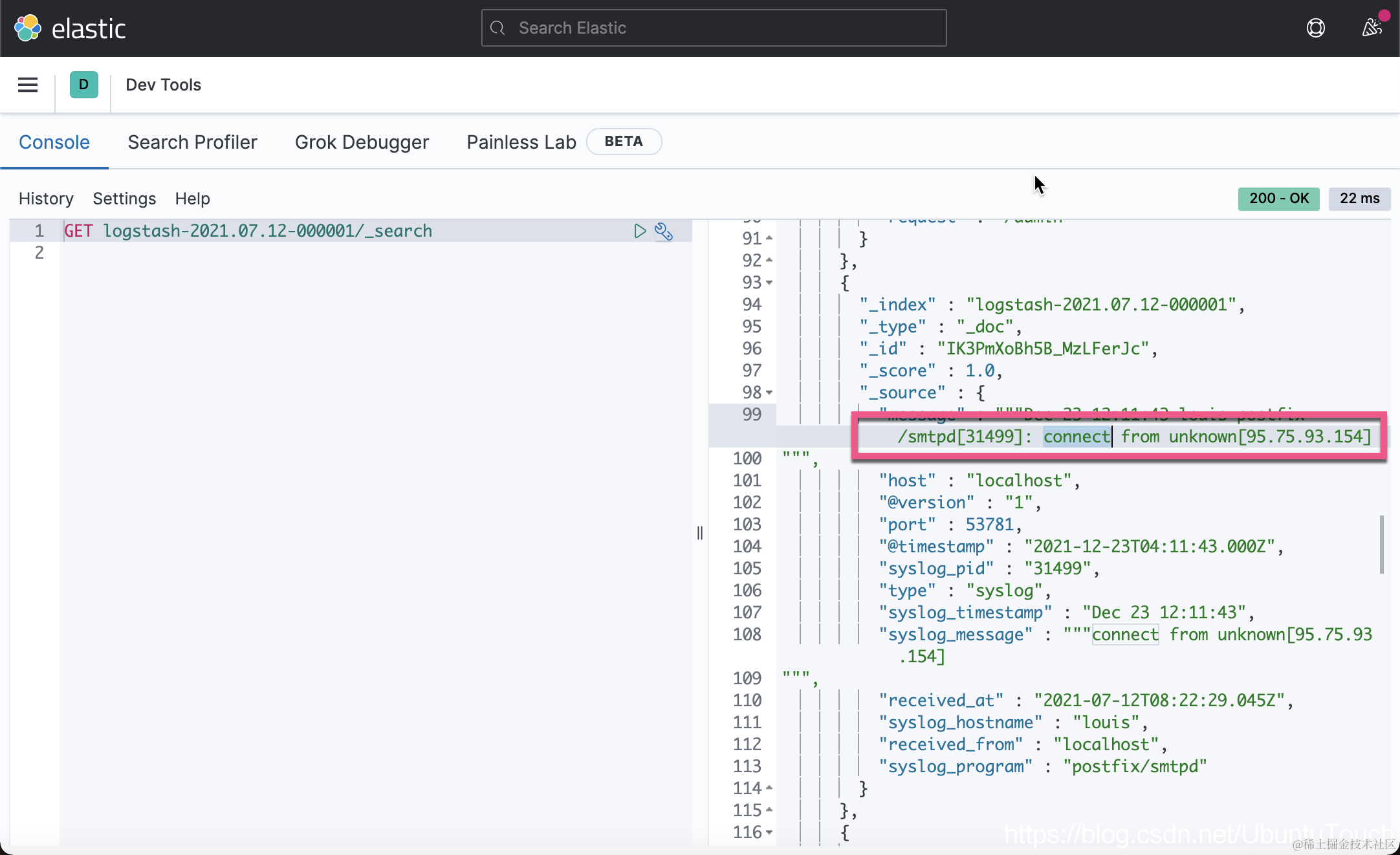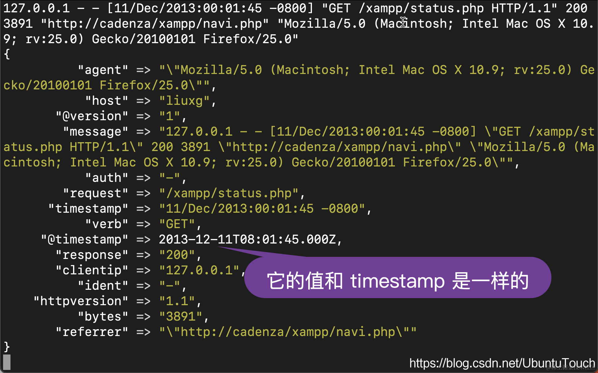 在上面,我们可以看到经过 grok 过滤器处理后,有一个叫做 timestamp 的字段。在 Elasticsearch 的日志中,我们习惯使用 @timestamp 来作为日志的时间标签。我们使用 date 过滤器来对它做转换。经过这样的处理后,日志的 @timestamp 的值将取自 timestamp 字段的值。
