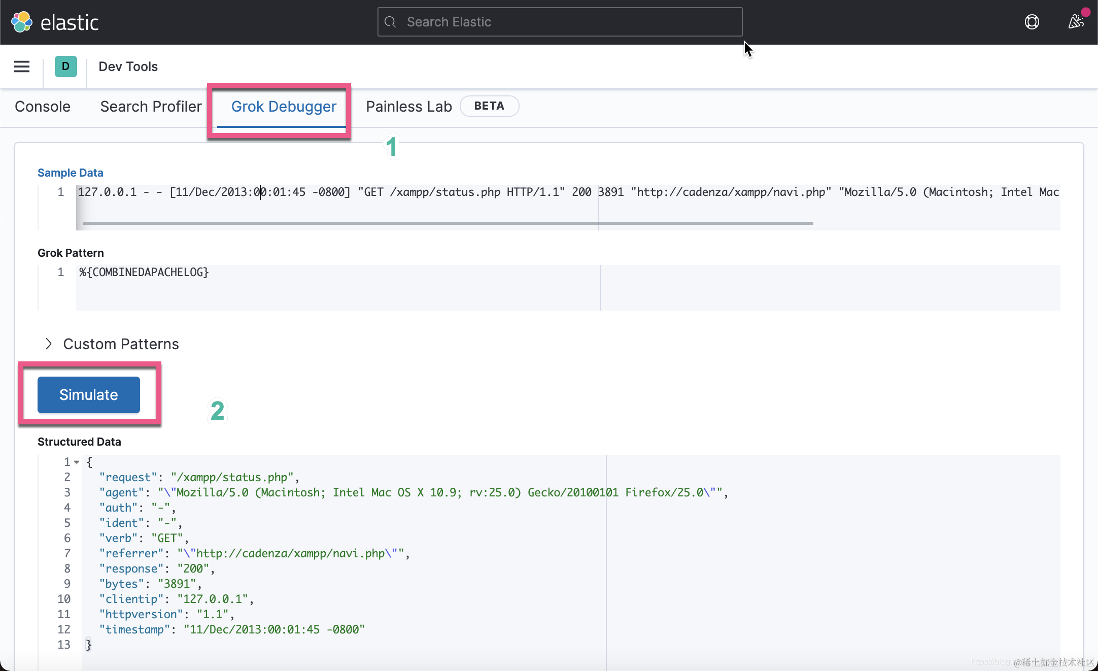 在上面,我们使用 stdin 来做为输入,也就是使用 console 来进行输入。关于上面的 grok 过滤器,我们可以使用 Elastic 的 grok debugger 来进行验证: