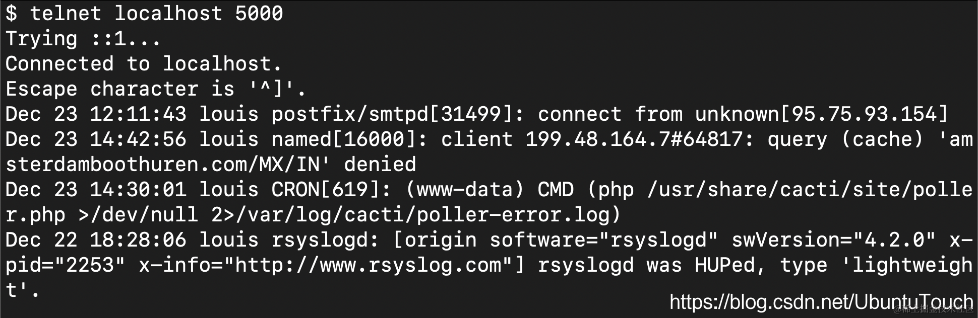 通常,客户端计算机会连接到端口 5000 上的 Logstash 实例并发送其消息。 在这个例子中,我们将 telnet 到 Logstash 并输入一个日志行(类似于我们之前在 STDIN 中输入日志行的方式)。 等 Logstash 完全运行起来后,打开另一个 shell 窗口以与 Logstash syslog 输入交互并输入以下命令: