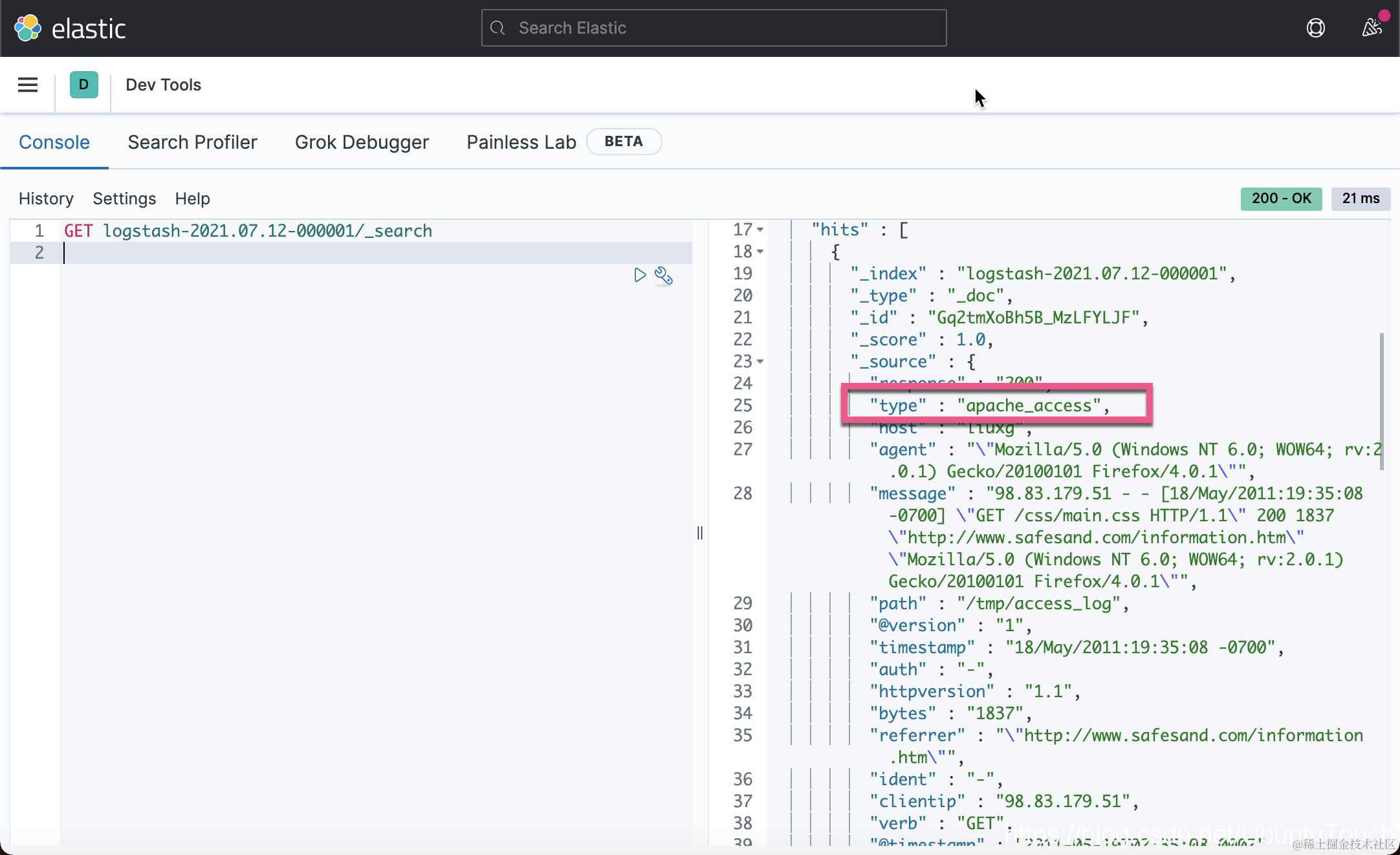 在上面的 filter 中,我们添加了对 path 路径的检查。如果路径中含有 access 字符串,则添加字段 type 为 apache_access。