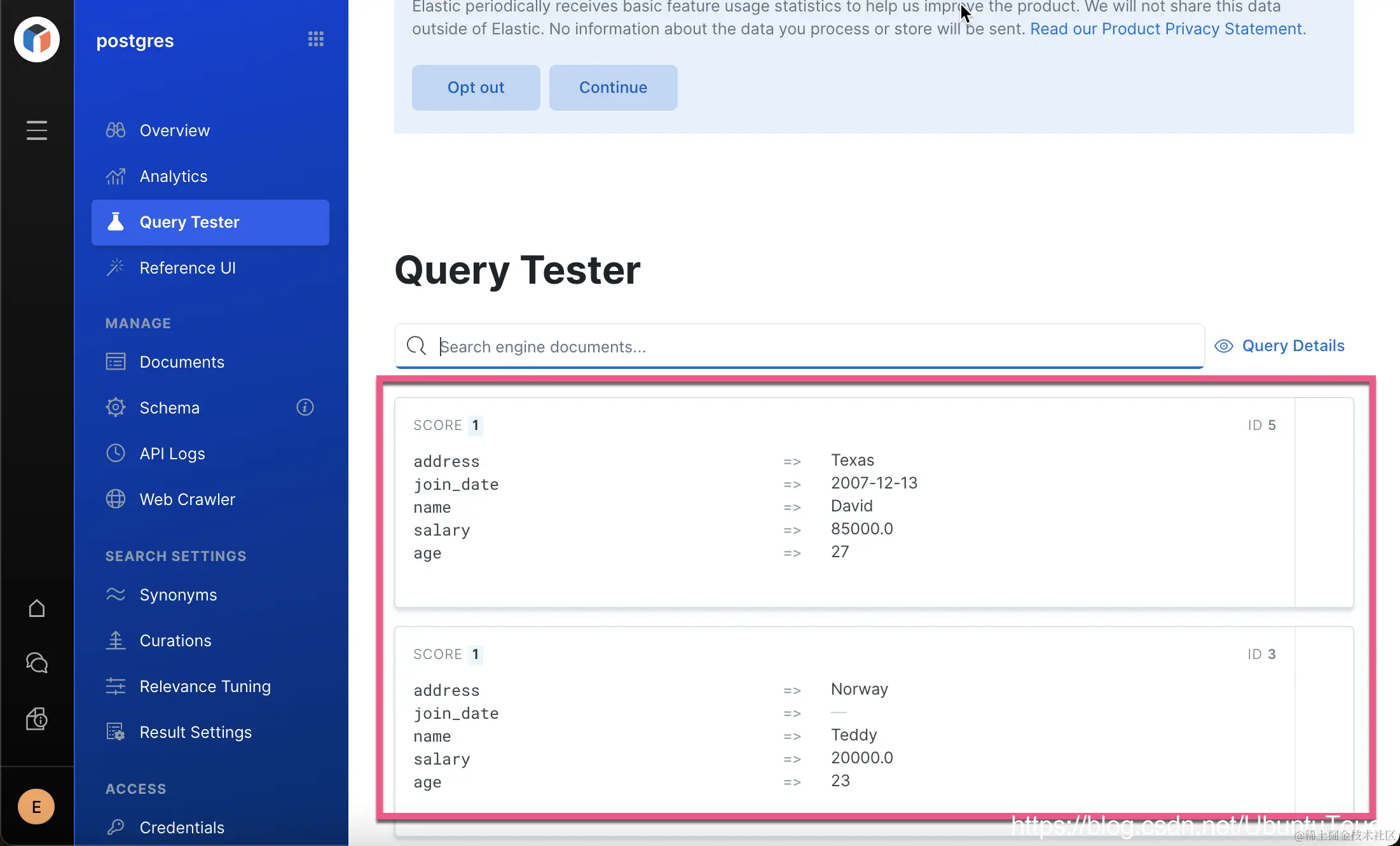 好了到目前为止,我们成功地把 Postgres 里的数据导入到 App Search 中。在实际的使用中,我们的 Postgres 数据库可能需要添加或者修改数据,那么在这种情况下,我们建议在添加或删除 Postgres 数据库的同时也通过 API 的方法来对相应的数据进行更新或者删除。这个就留给你们做了。