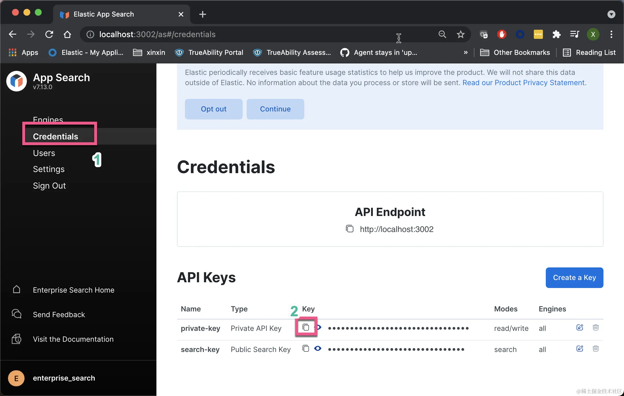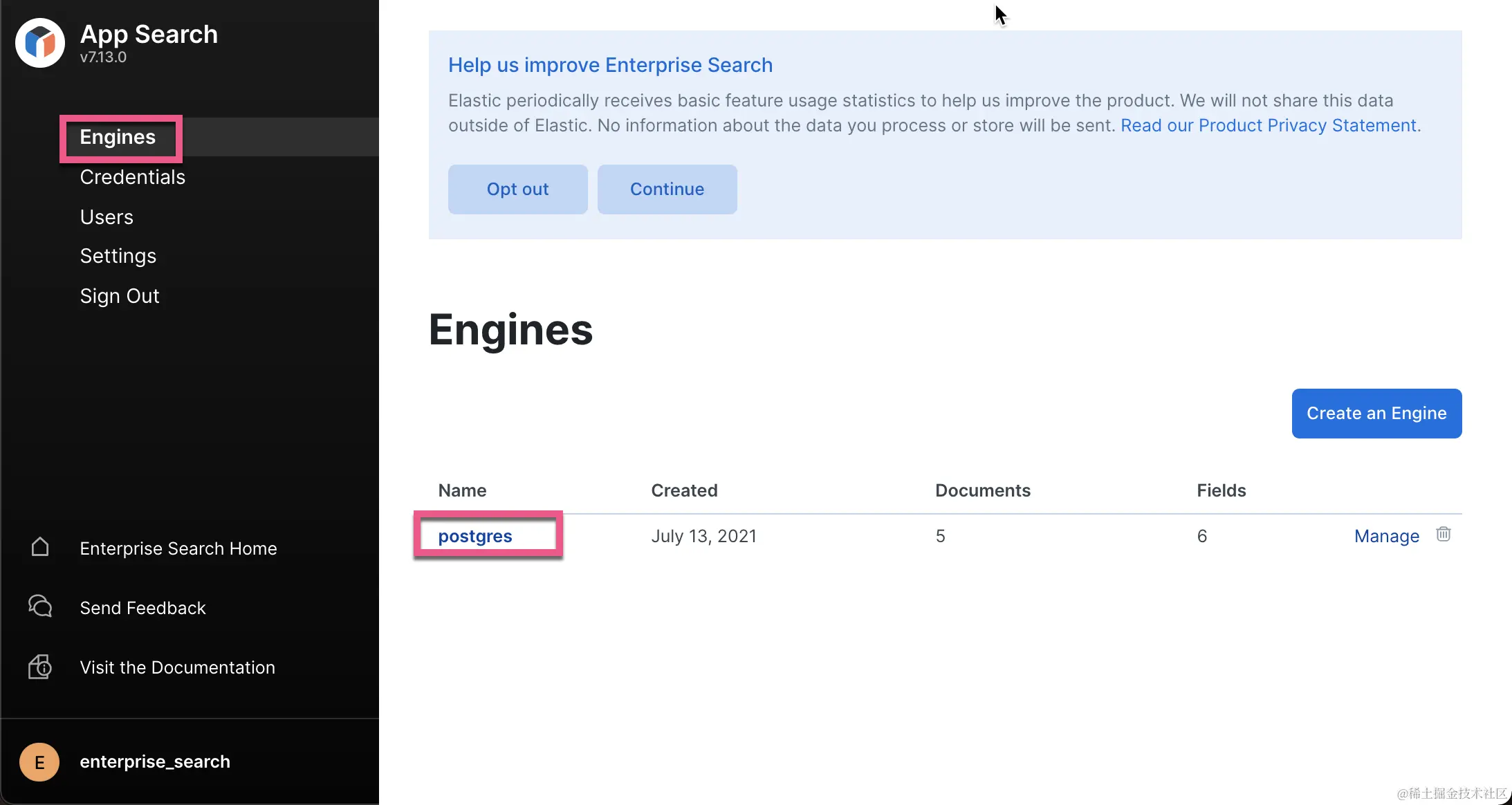 在 terminal 中,我们可以看到运行完全成功。我们回到 App Search 中去查看: