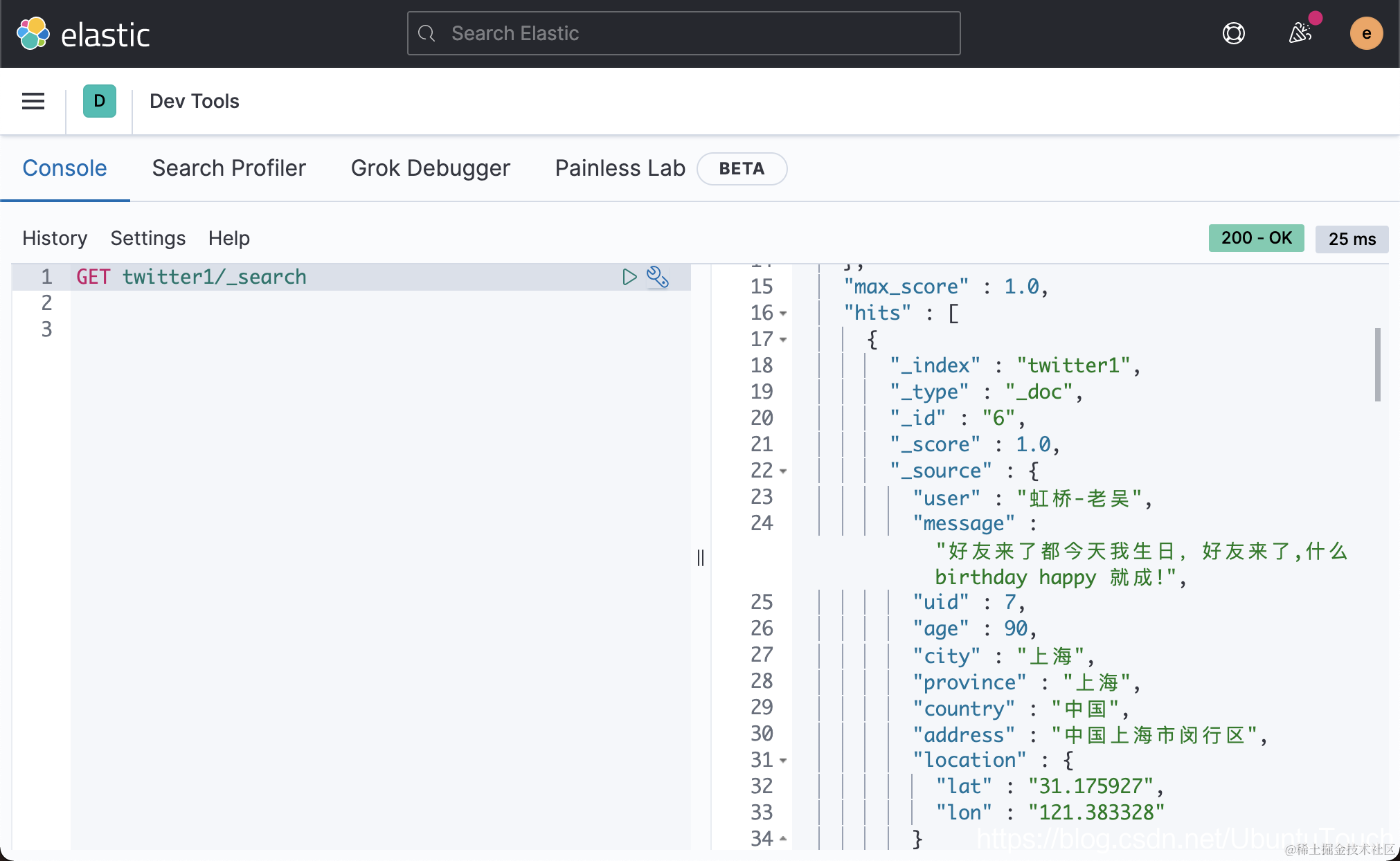 {"user":"东城区-李四","message":"happy birthday!","uid":4,"age":30,"city":"北京","province":"北京","country":"中国","address":"中国北京市东城区","location":{"lat":"39.893801","lon":"116.408986"}}