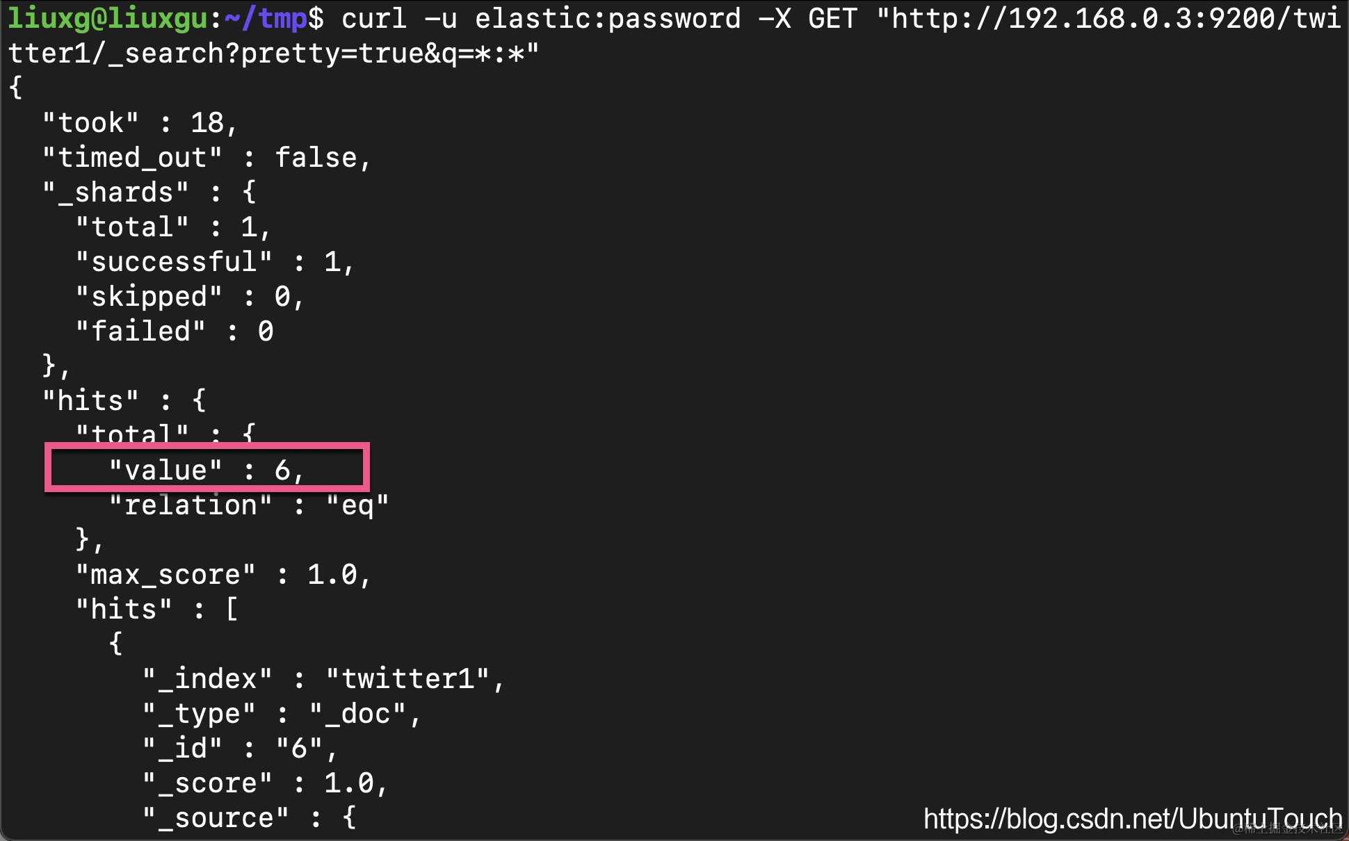 显然在上面的文件中,它包含了我们之前导入到 twitter 索引中的6个文档。