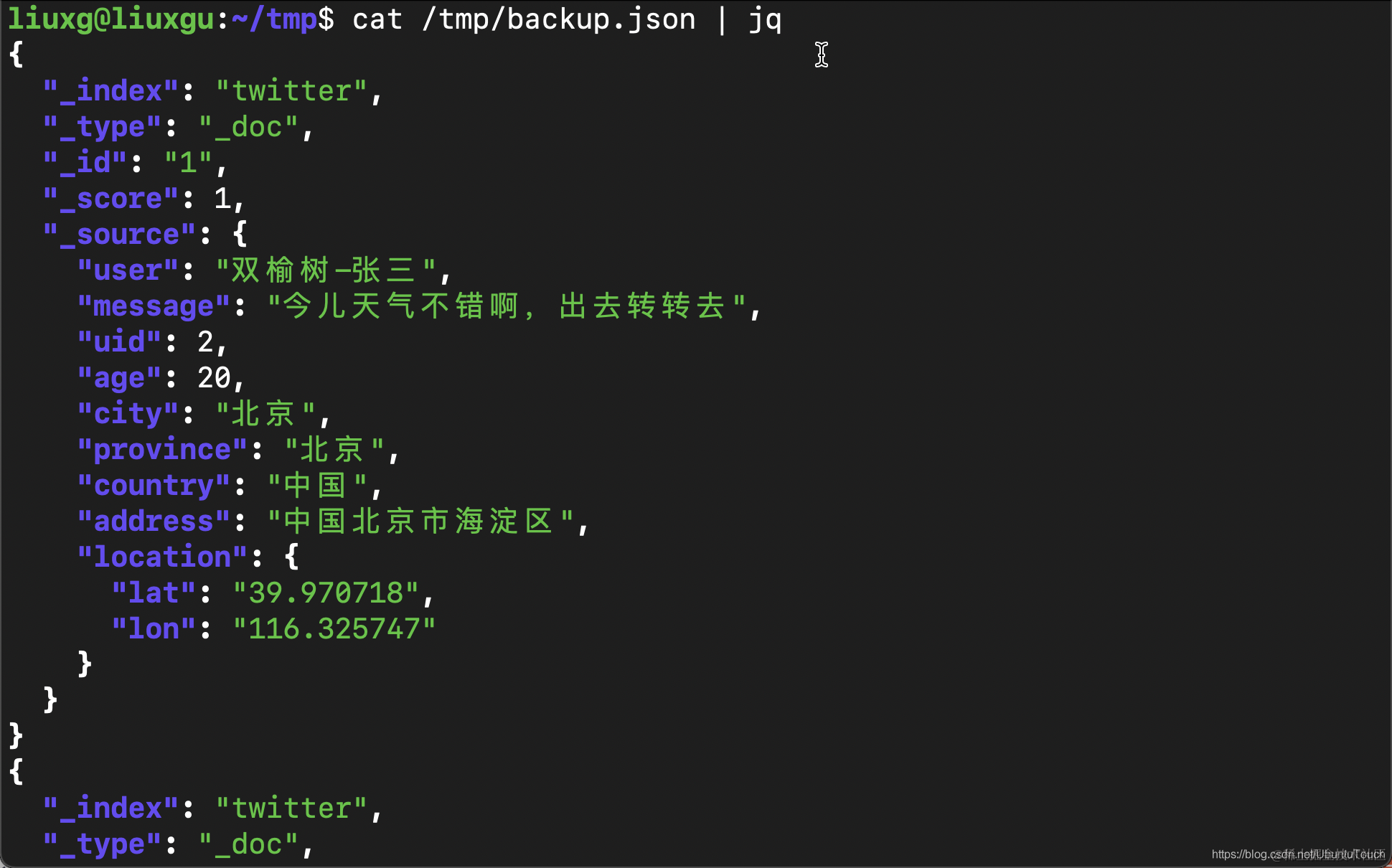 {"user":"双榆树-张三","message":"今儿天气不错啊,出去转转去","uid":2,"age":20,"city":"北京","province":"北京","country":"中国","address":"中国北京市海淀区","location":{"lat":"39.970718","lon":"116.325747"}}