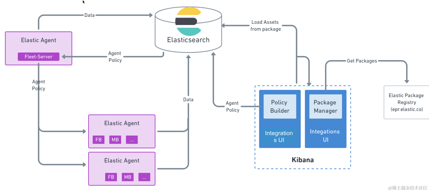 - Elastic Agent 使用策略中的配置信息来收集数据并将其发送到 Elasticsearch。
