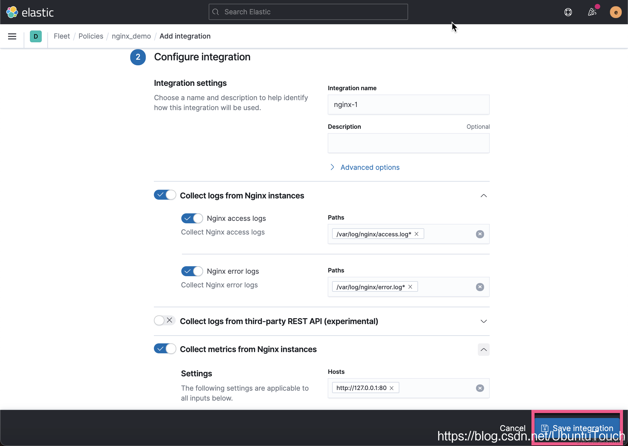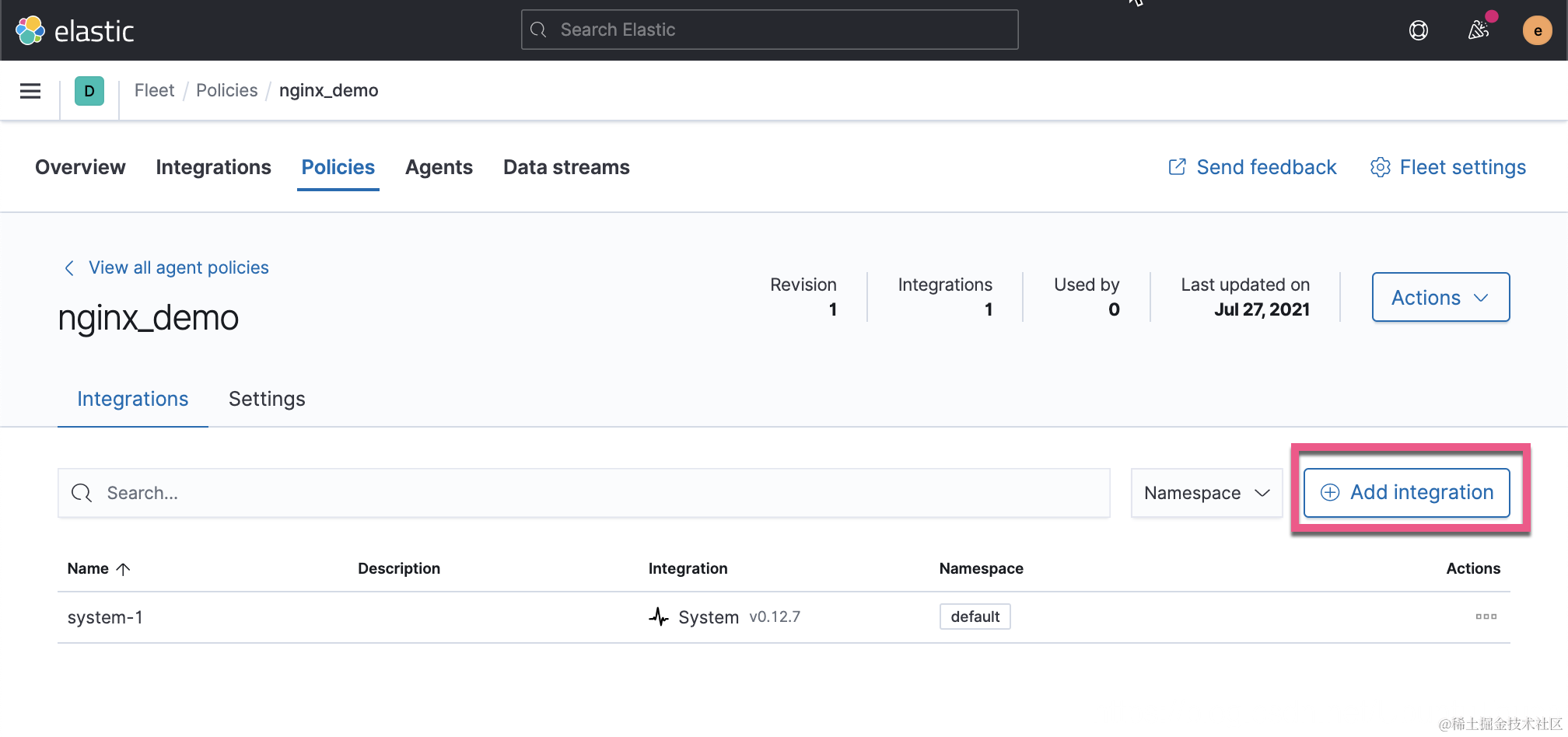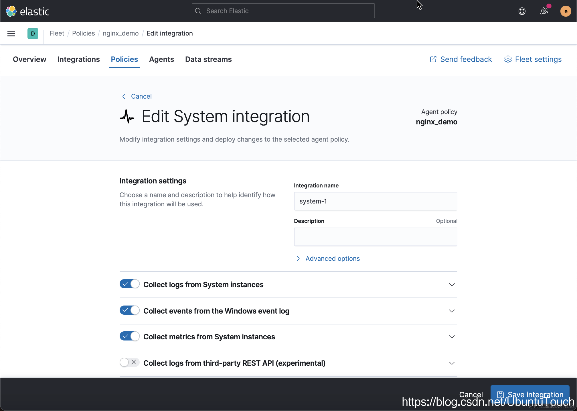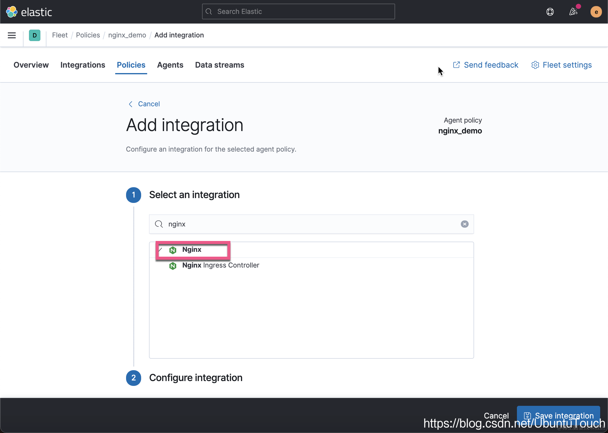 如上所示,它采集系统的日志,Windows 系统的事件以及系统的指标等等。当然对于我们的 nginx_demo 这个 policy 来说,我们甚至可以删除 system-1 这个 integration,如果我们不是对它里面所采集的信息感兴趣的话。针对我的配置,我选择保留。接下来,我们来添加 nginx 这个 integration: