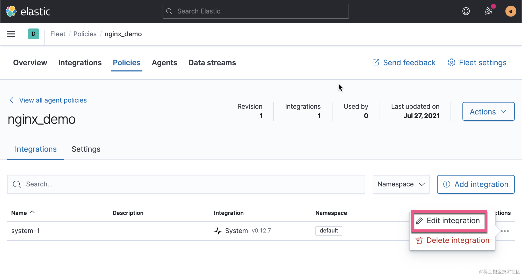 在这个 policy 里面,它已经包含了一个叫做 system-1 的 integration。我们可以点击 Edit integration 来查看这个 integration 里到底包含一些啥东东: