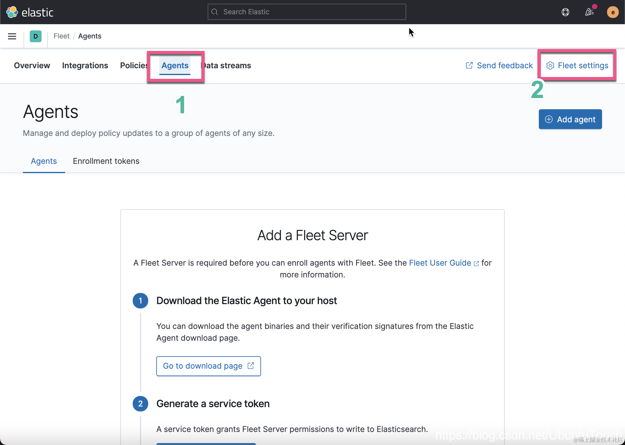 Fleet Server 是 Elastic Agent 用来与 Elasticsearch 通信的机制: