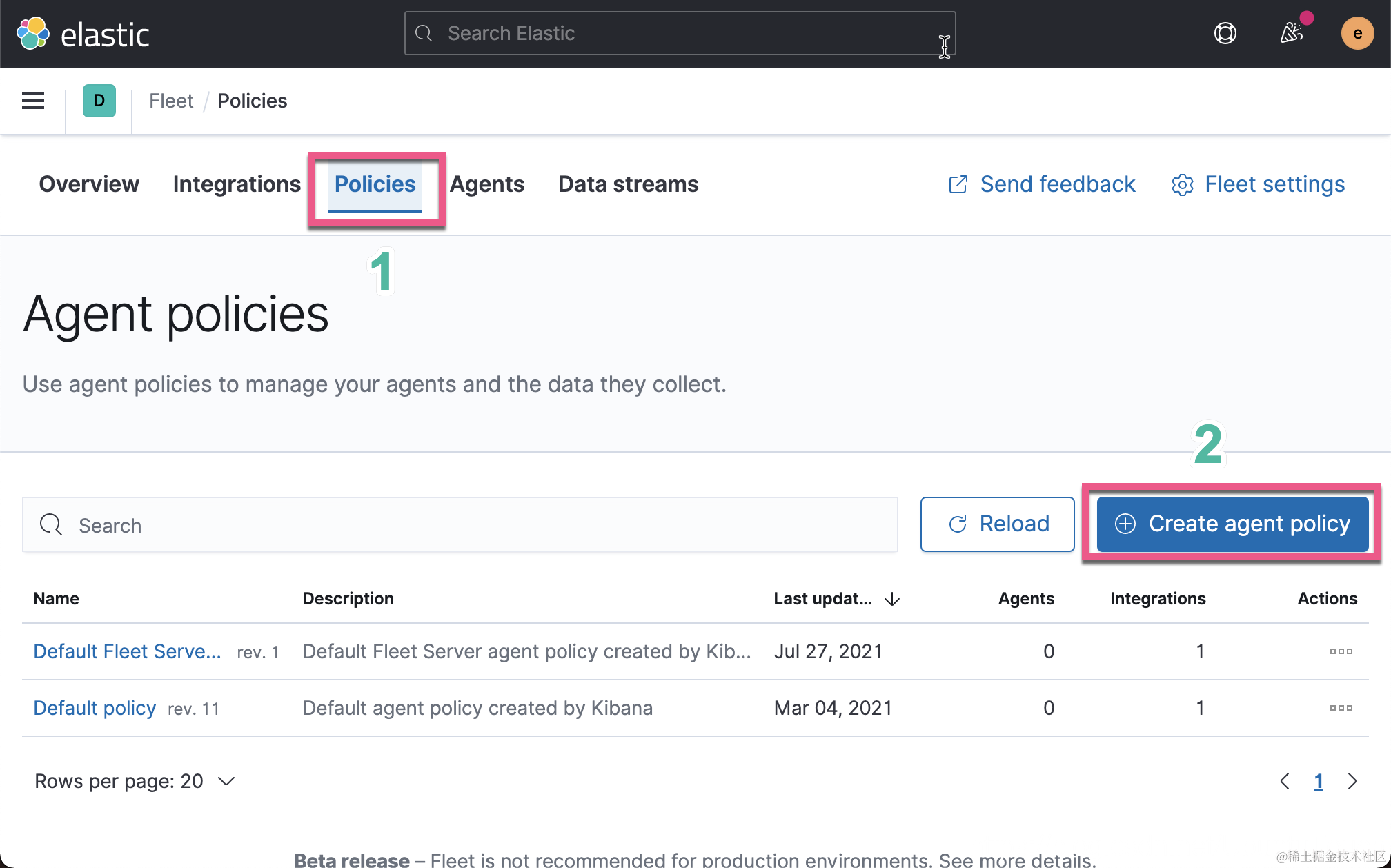 我有讲到如何使用 Ingest Manager 简化数据输入。今天我重新看了一下界面确实变了很多,这就是为什么实验版本的功能一直在演化中。Ingest Manager 的名字也被修改为 Fleet。另外从 7.13 开始,开始引入 Fleet Server。Fleet Server 是 Elastic Stack 的一个组件,用于集中管理 Elastic Agent。 它作为 Elastic Agent 的一部分在用作服务器的主机上启动。 一个 Fleet Server 进程可以支持多个 Elastic Agent 连接,并作为一个控制面来更新代理策略、收集状态信息和协调跨 Elastic Agent 的操作。