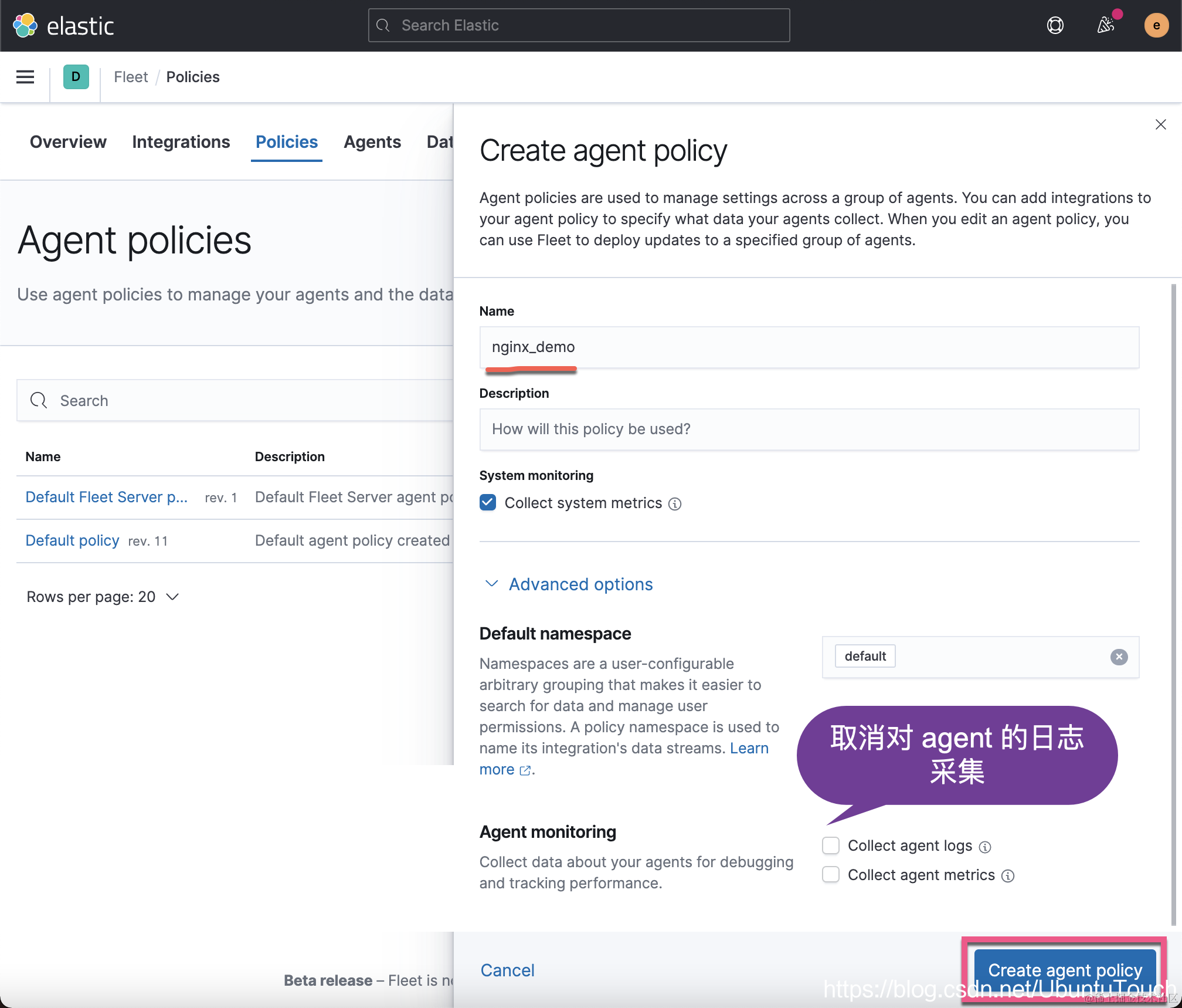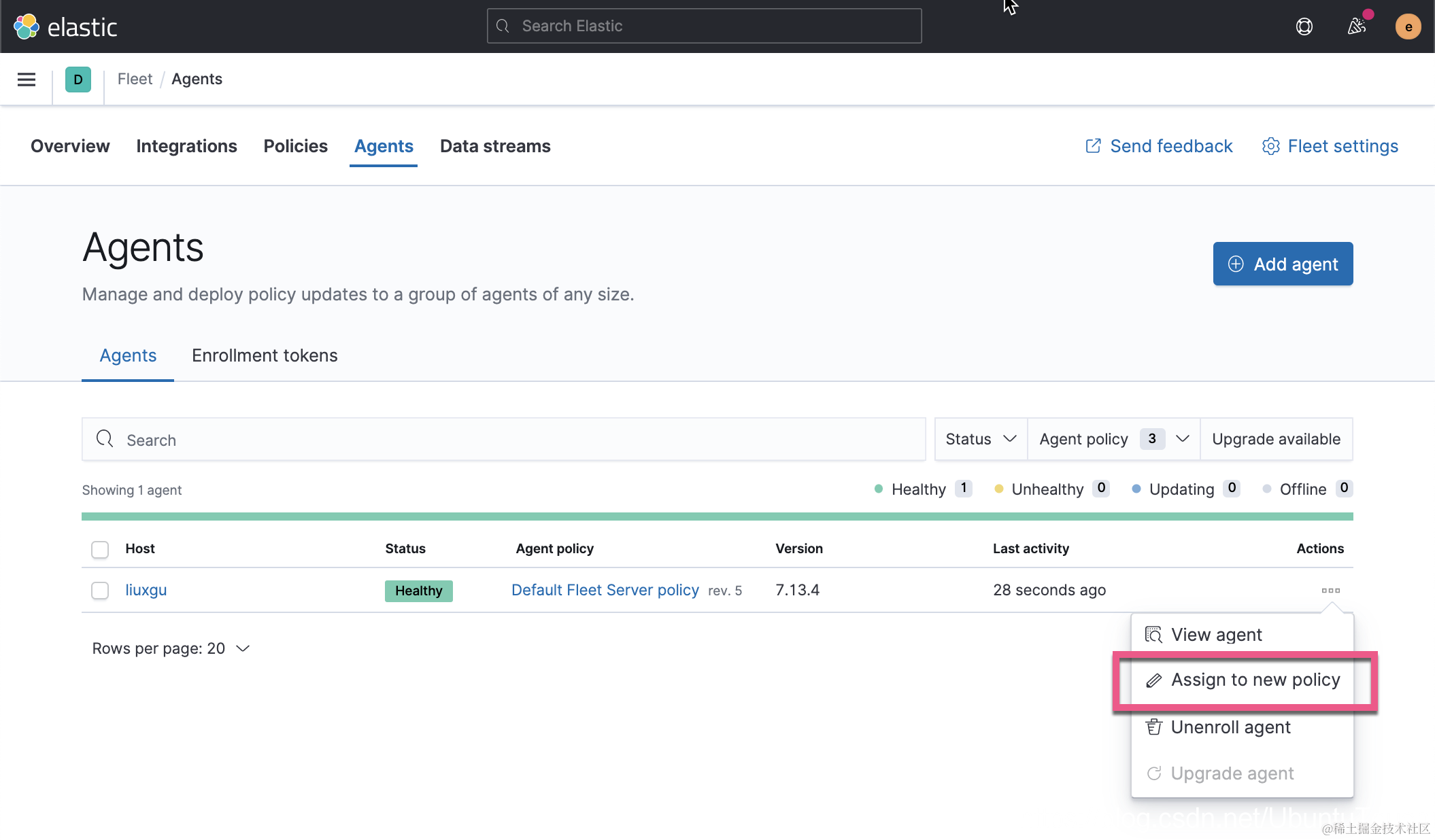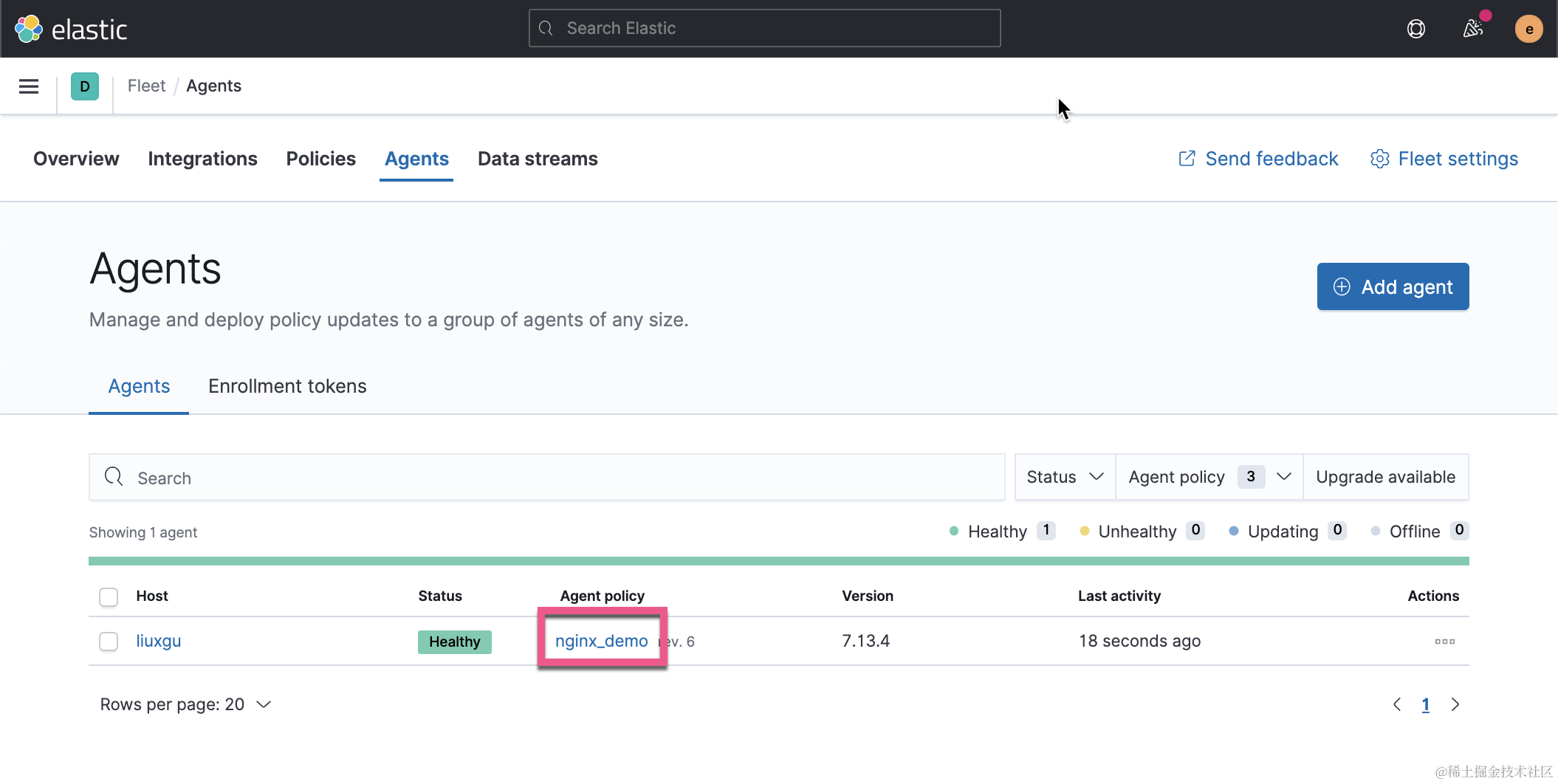 当我们看到上面的状态从 updating 变为 Healthy,它表明我们的安装时成功的。在上面,我们看到它绑定的 Agent policy 不是我们想要的 nginx_demo。我们需要修改为 nginx_demo。