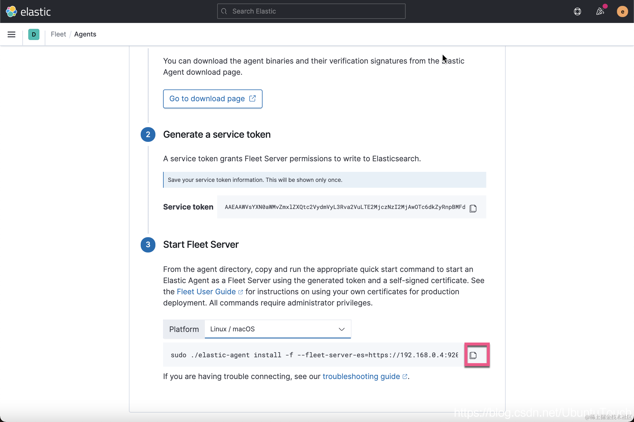 我们点击 Go to download page。针对我的情况,我安装 DEB 版本的 Elastic Agent: