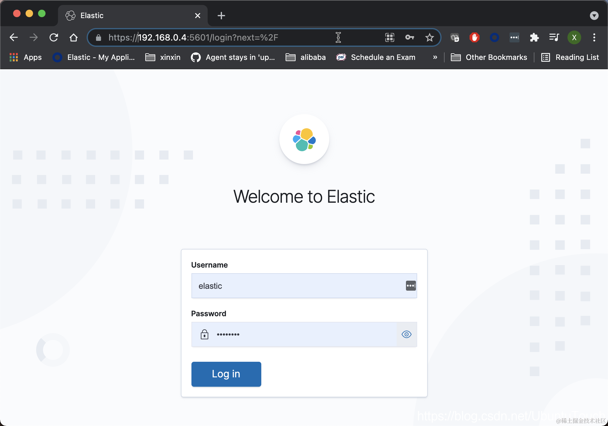 我们可以按照我之前的文章 “Security:如何安装 Elastic SIEM 和 EDR” 来安装 Elasticsearch 及 Kibana。我们为 Elasticsearch 及 Kibana 配置上安全及 HTTPS 访问,尽管 HTTPS 不是不必要的。针对我的配置,我使用一台 Ubuntu 系统的集群安装 Elasticsearch 及 Kibana,并且它的 IP 地址为 193.168.0.4。安装完毕后,我们必须使用 https://192.168.0.4:5601 来登录 Kibana: