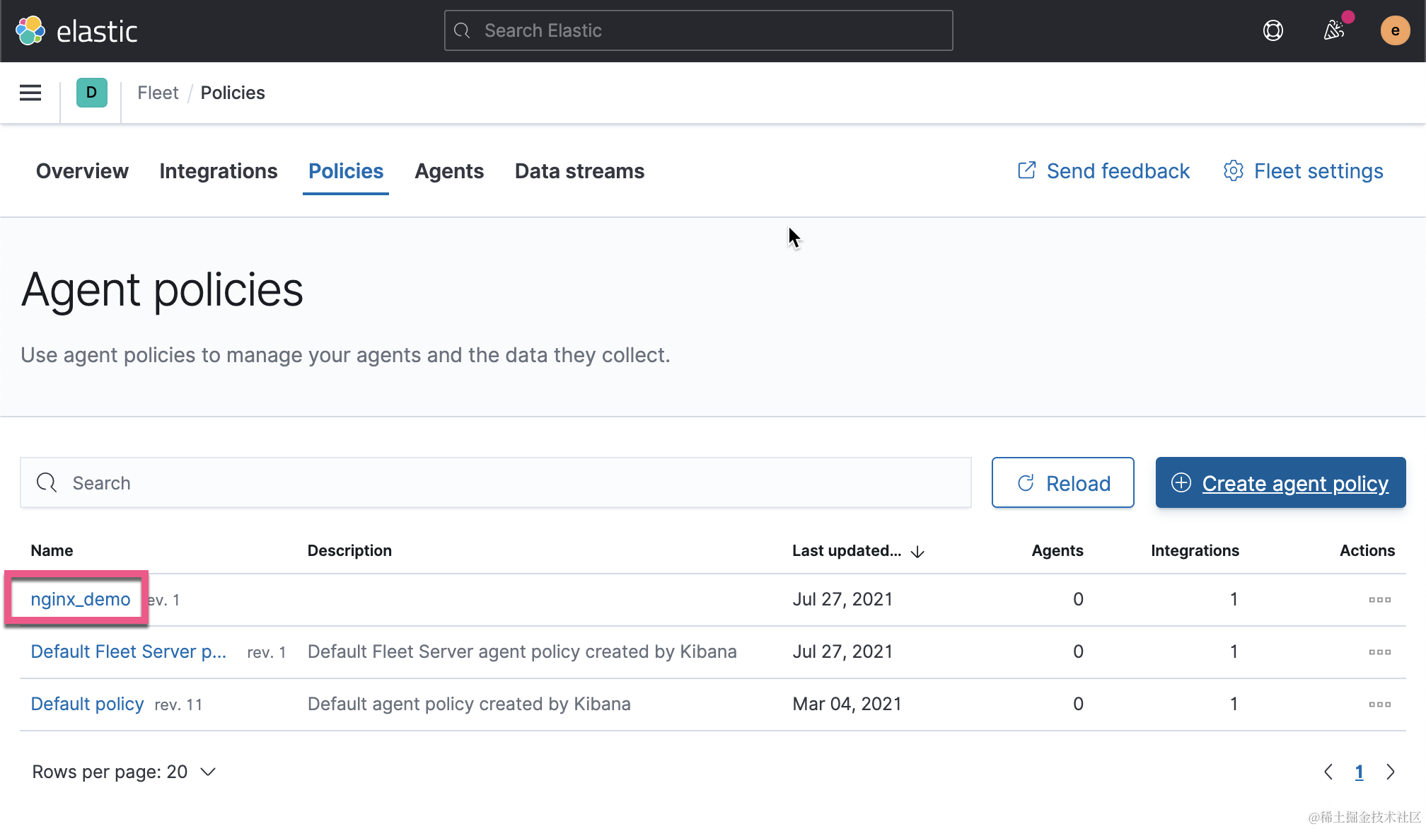- 创建新的代理策略后,它会保存到 Elasticsearch。