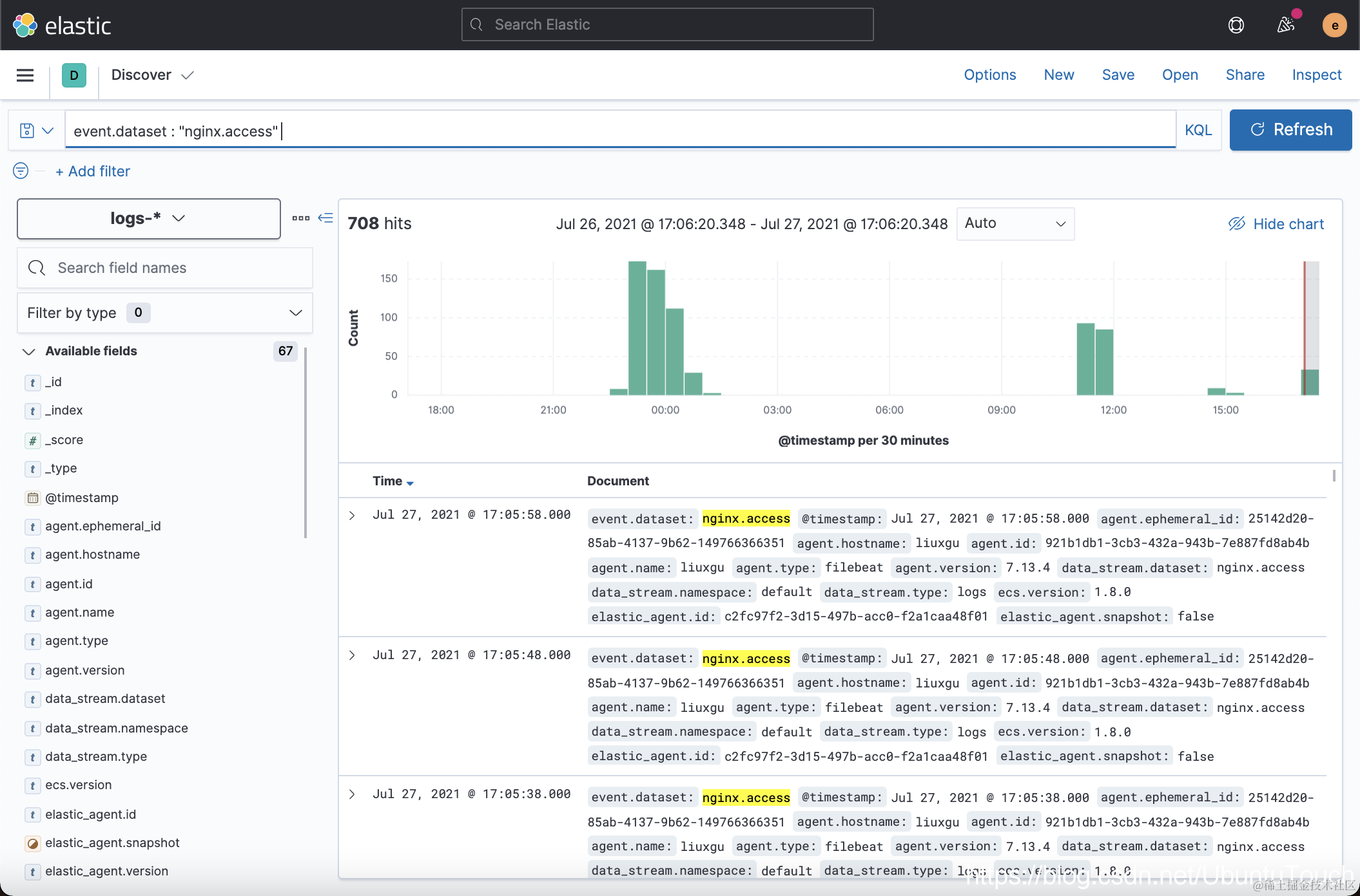 我们在 Discover 上查看数据。我查找 logs-* 索引模式。
