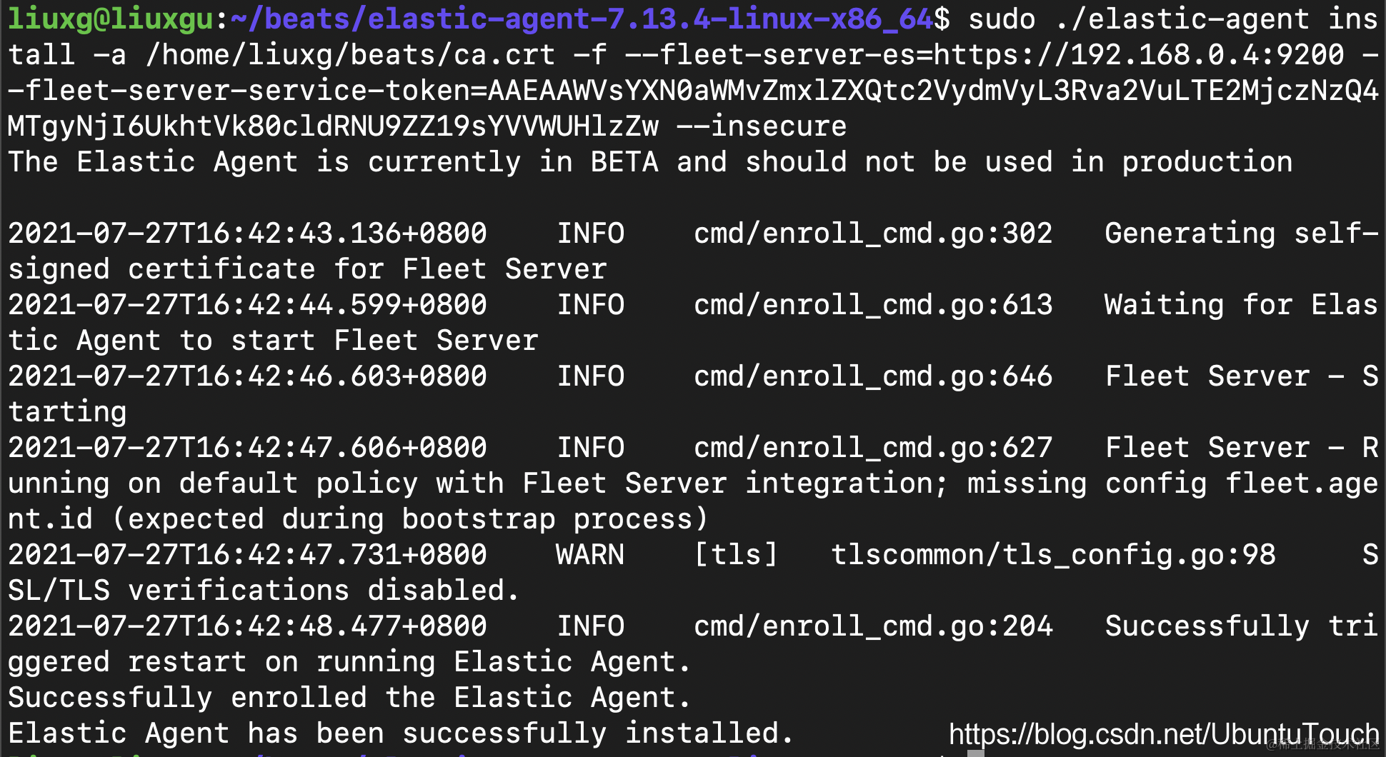 sudo ./elastic-agent install -a /home/liuxg/beats/ca.crt -f --fleet-server-es=https://192.168.0.4:9200 --fleet-server-service-token=AAEAAWVsYXN0aWMvZmxlZXQtc2VydmVyL3Rva2VuLTE2MjczNzQ4MTgyNjI6UkhtVk80cldRNU9ZZ19sYVVWUHlzZw --insecure