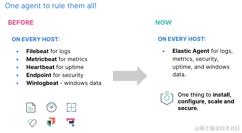 从安装的角度来说,Elastic agent 一个 agent 代替之前所有的 Beats: