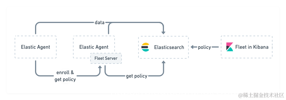 - Fleet Server 接收请求并从 Elasticsearch 获取代理策略,然后将该策略发送到在该策略中注册的所有 Elastic Agent。