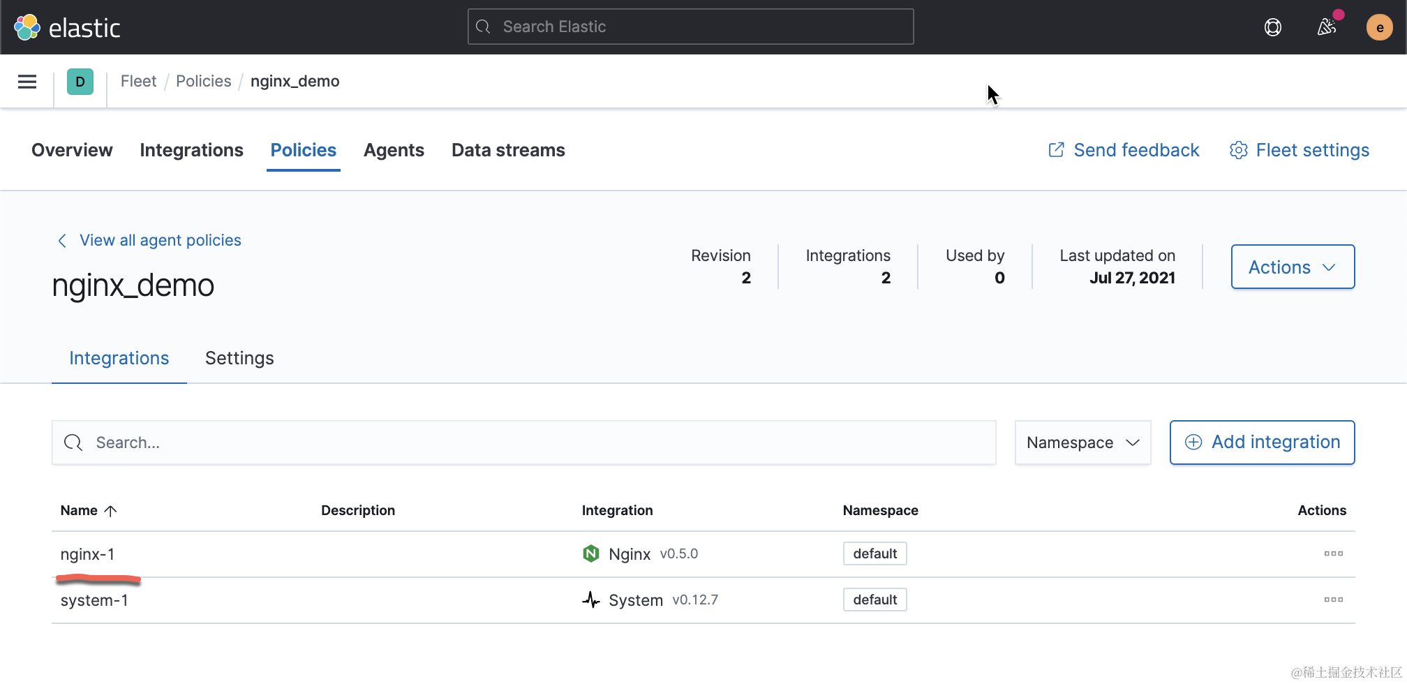 如上图所示,我们可以看见一个新增加的 nginx-1 的 integration。