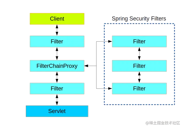 Spring SecurityFilter在链中作为单个安装,其具体类型为FilterChainProxy,原因我们稍后会介绍。在 Spring Boot 应用程序中,安全过滤器位于@Bean中ApplicationContext,默认情况下会安装它,以便将其应用于每个请求。它安装在由 定义的位置SecurityProperties.DEFAULT_FILTER_ORDER,而该位置又由FilterRegistrationBean.REQUEST_WRAPPER_FILTER_MAX_ORDER(Spring Boot 应用程序在包装请求、修改其行为时希望过滤器具有的最大顺序)锚定。但是,还有更多:从容器的角度来看,Spring Security 是一个单一的过滤器,但是,在它内部,还有额外的过滤器,每个过滤器都扮演着特殊的角色。下图显示了这种关系: