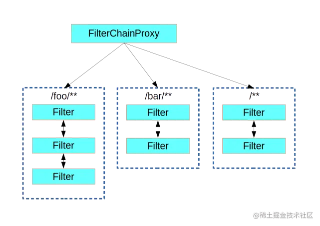 可以有多个过滤器链,所有过滤器链都由同一顶层的 Spring Security 管理,FilterChainProxy并且容器都不知道所有过滤器链。Spring Security 过滤器包含一个过滤器链列表,并将请求分派到匹配它的第一个链。下图显示了基于匹配请求路径(/foo/匹配之前/)发生的调度。这是很常见的,但不是匹配请求的唯一方法。这个调度过程最重要的特点是只有一个链处理一个请求。