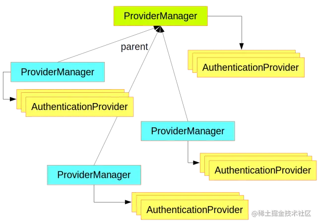 有时,应用程序具有受保护资源的逻辑组(例如,匹配路径模式的所有 Web 资源,例如/api/**),并且每个组都可以有自己的专用AuthenticationManager. 通常,这些中的每一个都是一个ProviderManager,并且它们共享一个父级。父级是一种“全局”资源,充当所有提供者的后备。