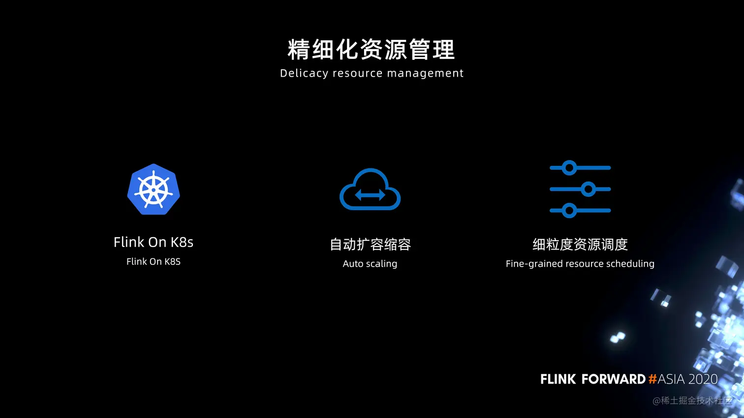 其次,基于 Flink On Kubernets 、任务的自动弹性扩缩容,Task 级别的细粒度资源调度实现精细化的资源调度管理,使得 Flink 任务达到全面的弹性化和云原生化。