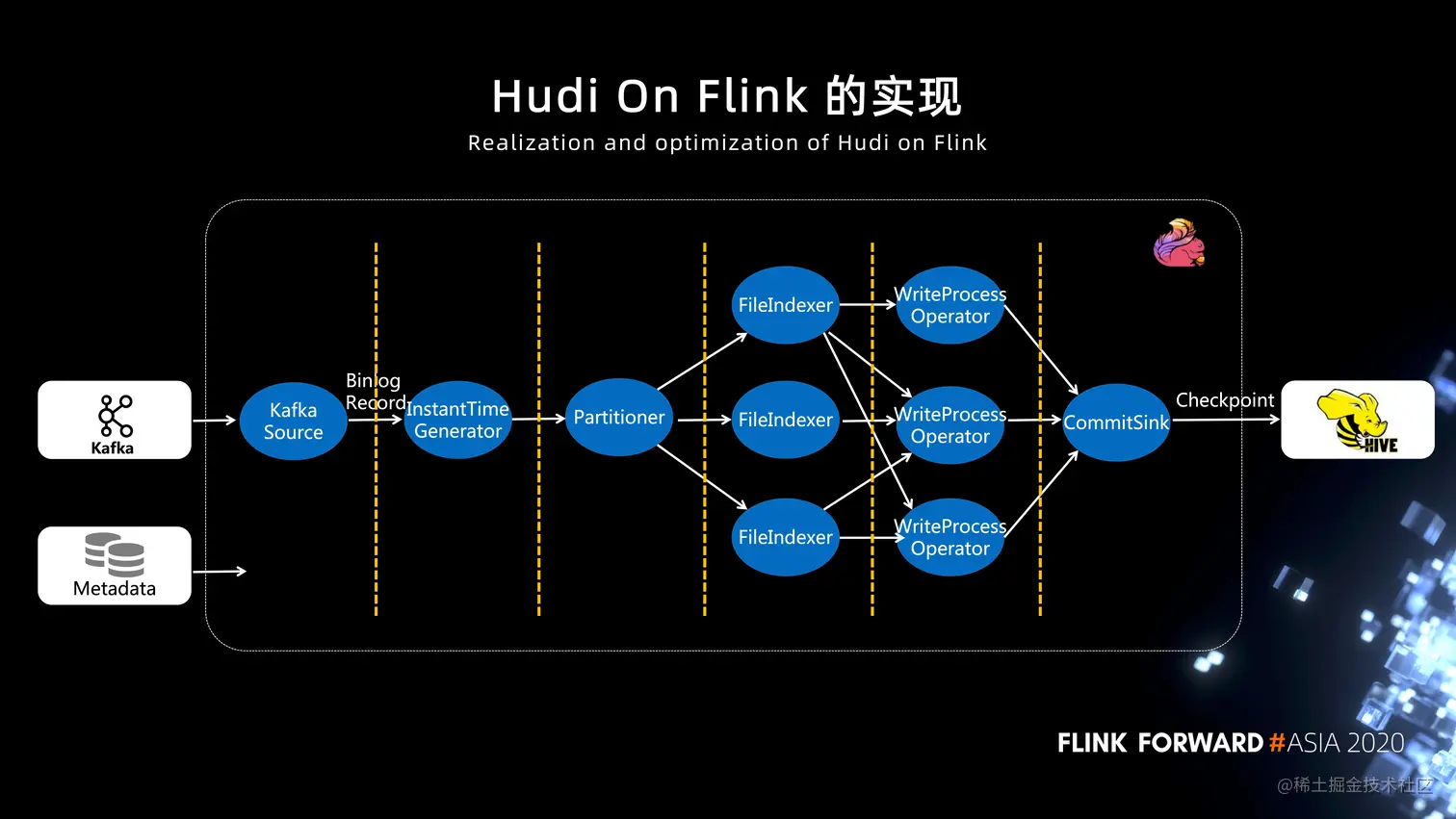 这里介绍下 Hudi On Flink 的原理。Hudi 原先与 Spark 强绑定,它的写操作本质上是批处理的过程。为了解耦 Spark 并且统一 API ,Hudi On Flink 采用的是在 Checkpoint 期间攒批的机制,在 Checkpoint 触发时将这一批数据Upsert 到 Hive,根据 Upsert 结果统一提交或回滚。