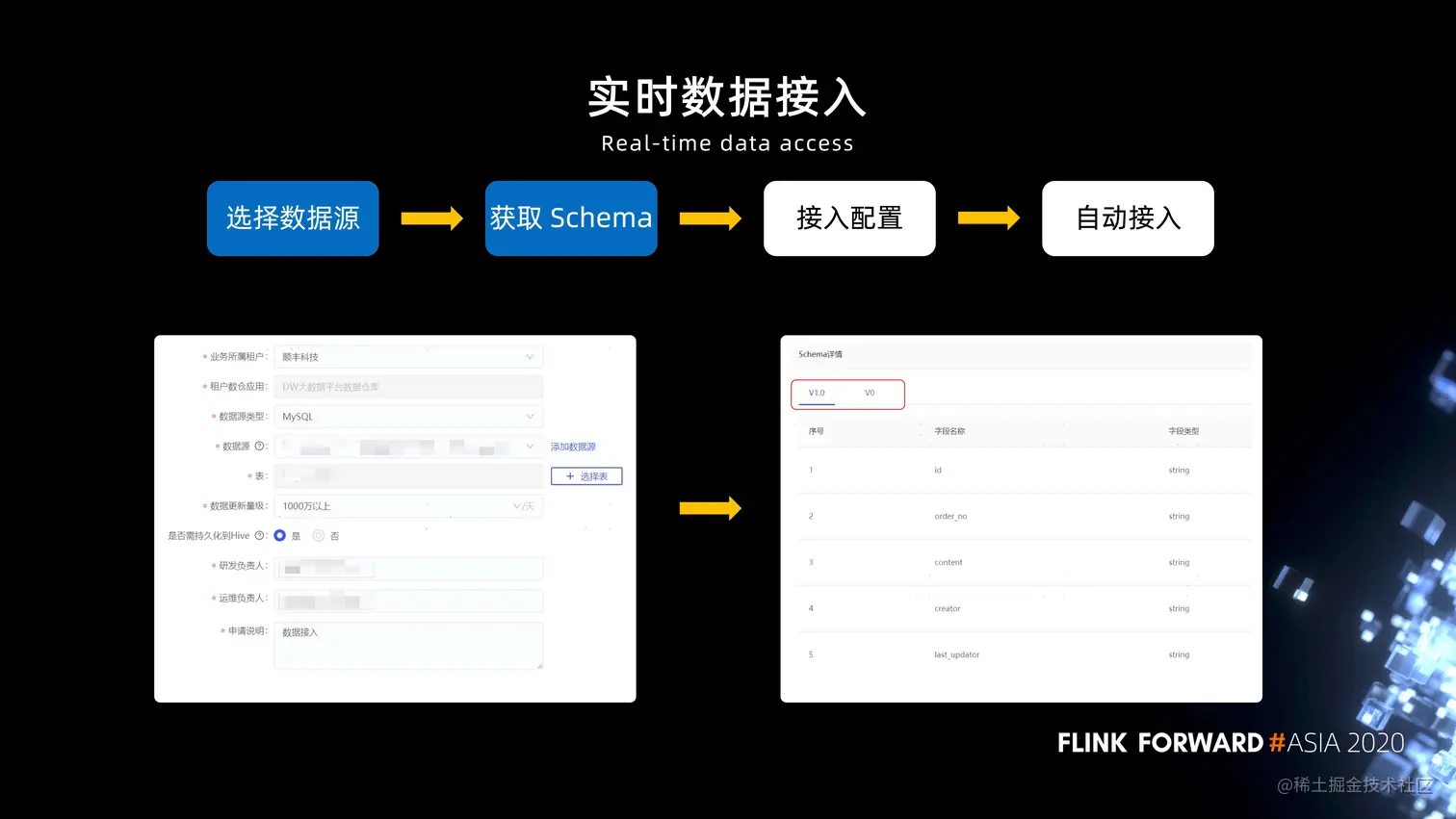 实时数据接入采用的是表单式的流程接入方式,屏蔽了复杂的底层技术,用户只需要经过简单的操作就可以将外部数据源接入到数仓体系。以 MySQL 为例,用户只需要选择 MySQL 数据源,平台就会自动抽取并展示 Schema ,用户确认 Schema 之后,就会将 Schema 插入到平台元数据中。