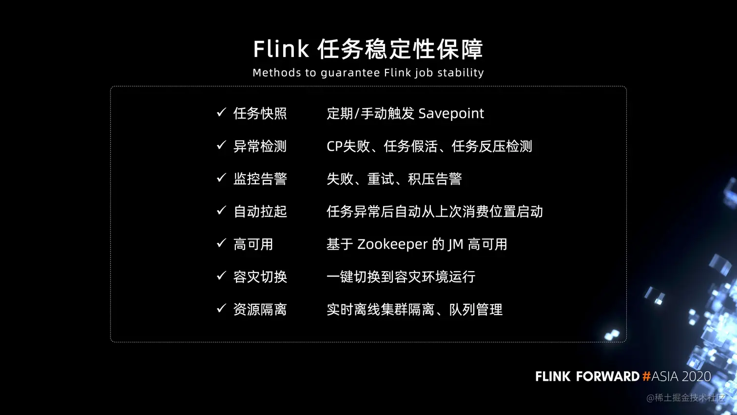 实时作业运维最关注的是稳定性,在保障 Flink 任务稳定性上我们也有一些实践。首先提供多种异常检测和监控告警的功能,方便用户快速的发现问题。每个任务都会定时的生成任务快照,保存任务历史的 Savepoint,以方便任务回滚和故障恢复。任务可能会由于某种异常原因导致任务失败,任务失败之后会被平台重新拉新,并指定从上次失败的位置开始重新消费。