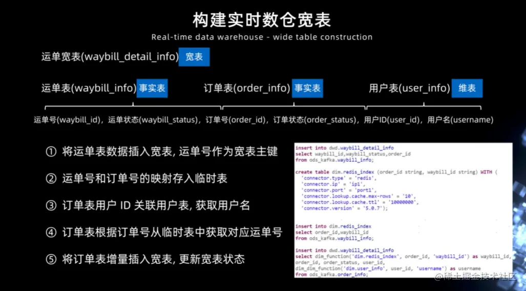 首先将运单表数据插入宽表,运单号作为宽表主键,并且将运单号和订单号的映射存入临时表。当订单表数据更新后,首先关联用户维表,获取用户名,再从临时表中获取对应运单号。最后根据运单号将订单表数据增量插入宽表,以更新宽表状态。