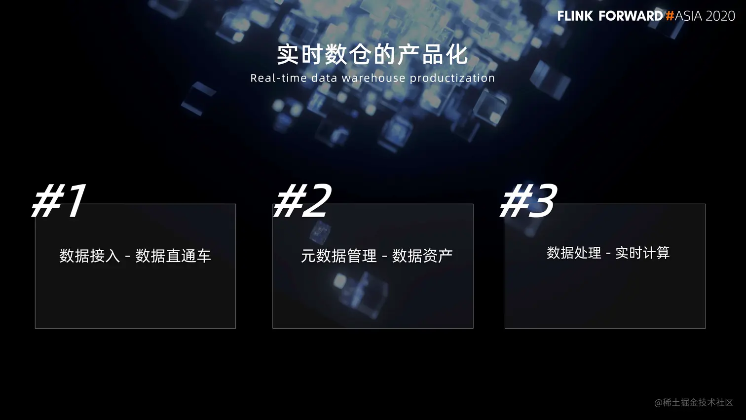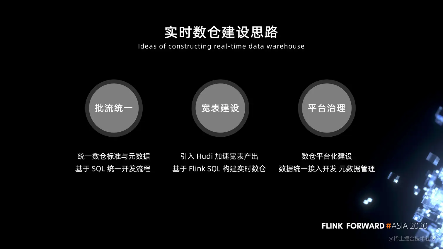 经过总结,我们提炼出以下 3 个实时数仓的建设思路。首先是通过统一数仓标准、元数据以及开发流程,使得用户达到开发体验上的批流统一。随后,引入 Hudi 加速数仓宽表,基于 Flink SQL 建设我们的实时数仓。最后是加强平台治理,进行数仓平台化建设,实现数据统一接入、统一开发、以及统一的元数据管理。