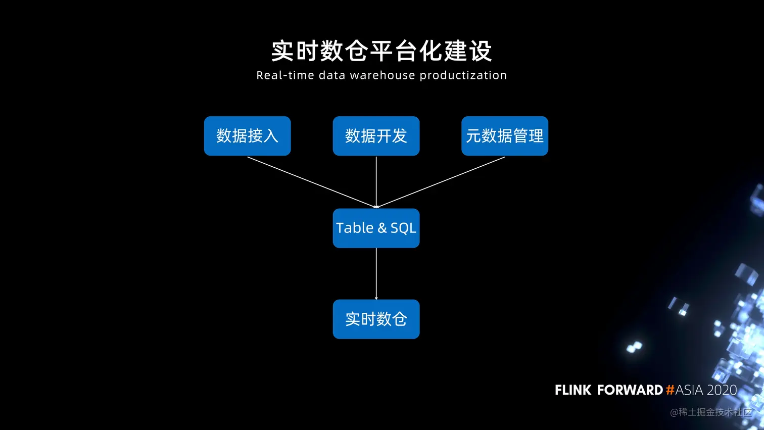 站在数据开发人员的角度,我们不仅要提供快速的数据接入能力,还需要关注开发效率以及统一的元数据治理。因此可以基于 Table 和 SQL 抽象,对数据接入、数据开发、元数据管理这三个主要功能进行平台化,为实时数仓用户提供统一、便捷、高效的体验。