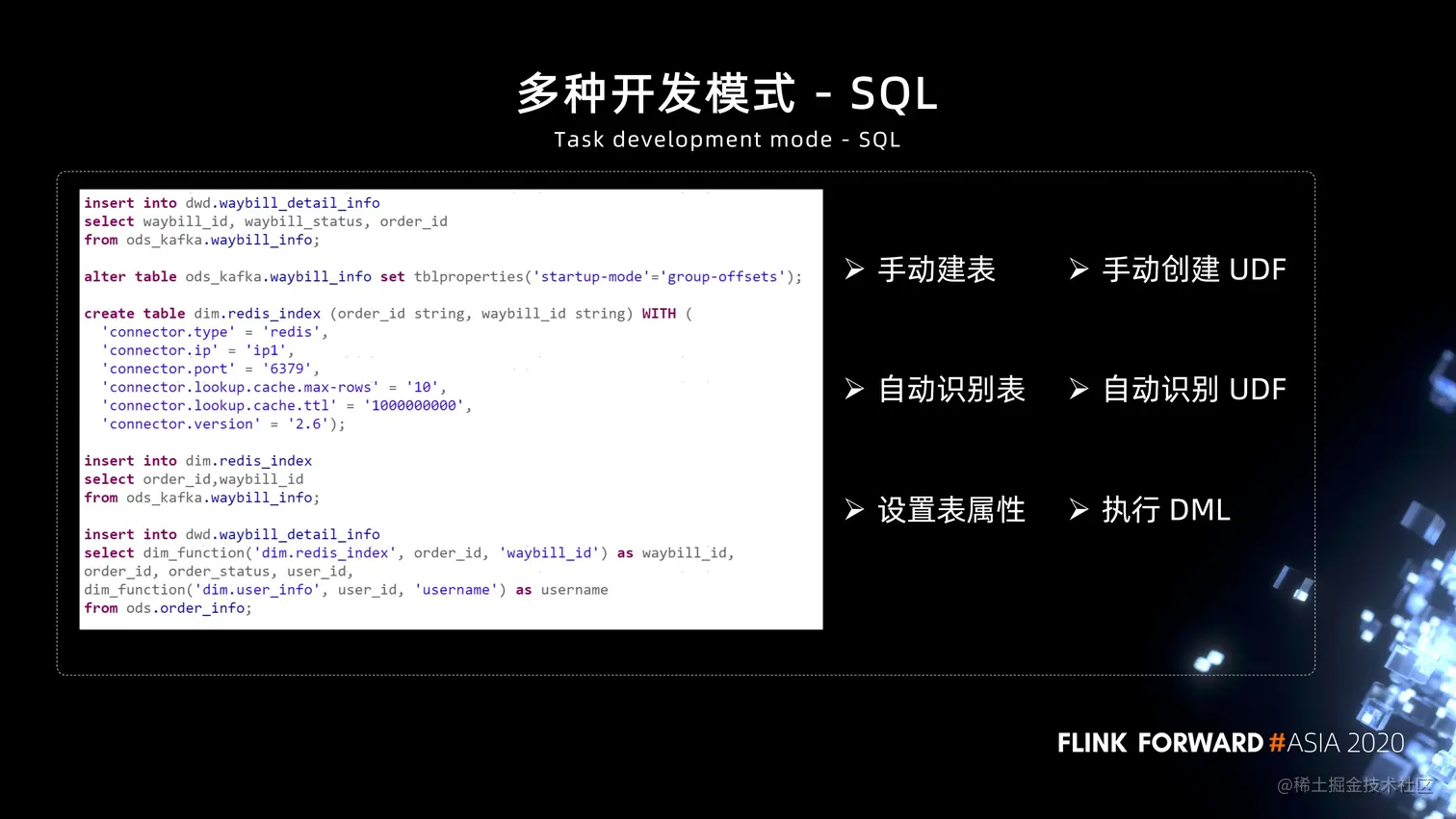 实时计算平台同样提供 SQL 开发模式,支持手动建表,根据元数据自动识别表及设置表属性。支持创建 UDF、自动识别 UDF、执行 DML 等。