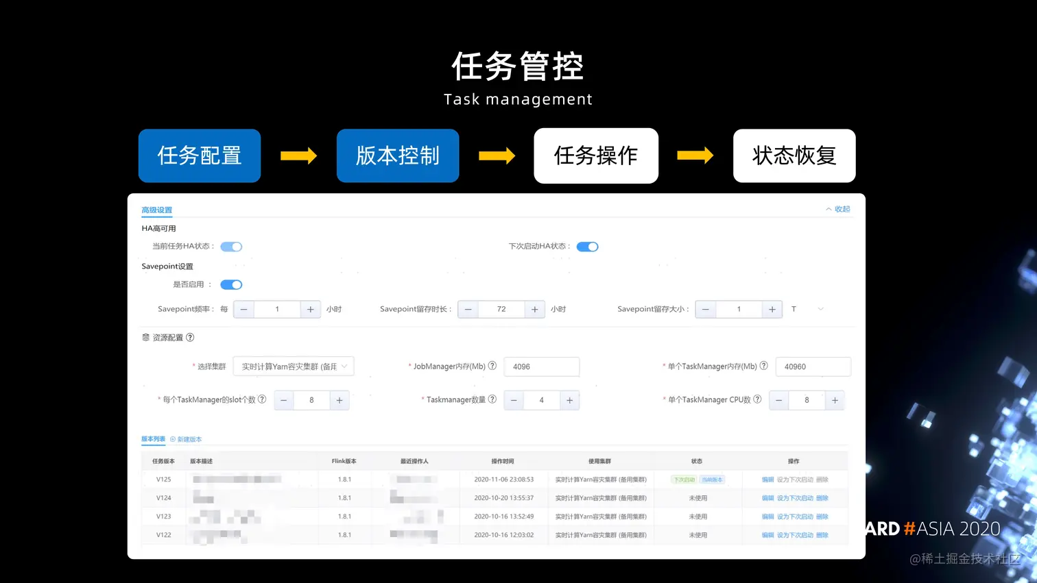 在任务管控方面,实时计算平台尽量简化任务的配置,屏蔽了一些复杂的配置。用户开发完成之后,只需要选择集群,填写资源,就能将任务提交到集群中运行。对每个任务,平台还提供了历史版本控制能力。