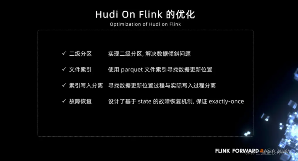 Hudi 写入过程的瓶颈在于如何快速找到记录要写入的文件并更新。为此 Hudi 提供了一套索引机制,该机制会将一个记录的键 + 分区路径的组合映射到一个文件 ID. 这个映射关系一旦记录被写入文件组就不会再改变。Hudi 当前提供了 HBase、Bloom Filter 和内存索引 3 种索引机制。然而经过生产实践,HBase 索引需要依赖外部的组件,内存索引可能存在 OOM 的问题,Bloom Filter 存在一定的误算率。我们研究发现,在 Hudi 写入的 parquet 文件中存在一个隐藏的列,通过读取这个列可以拿到文件中所有数据的主键,因此可以通过文件索引获取到数据需要写入的文件路径,并保存到 Flink 算子的 state 中,也避免了外部依赖和 OOM 的问题。